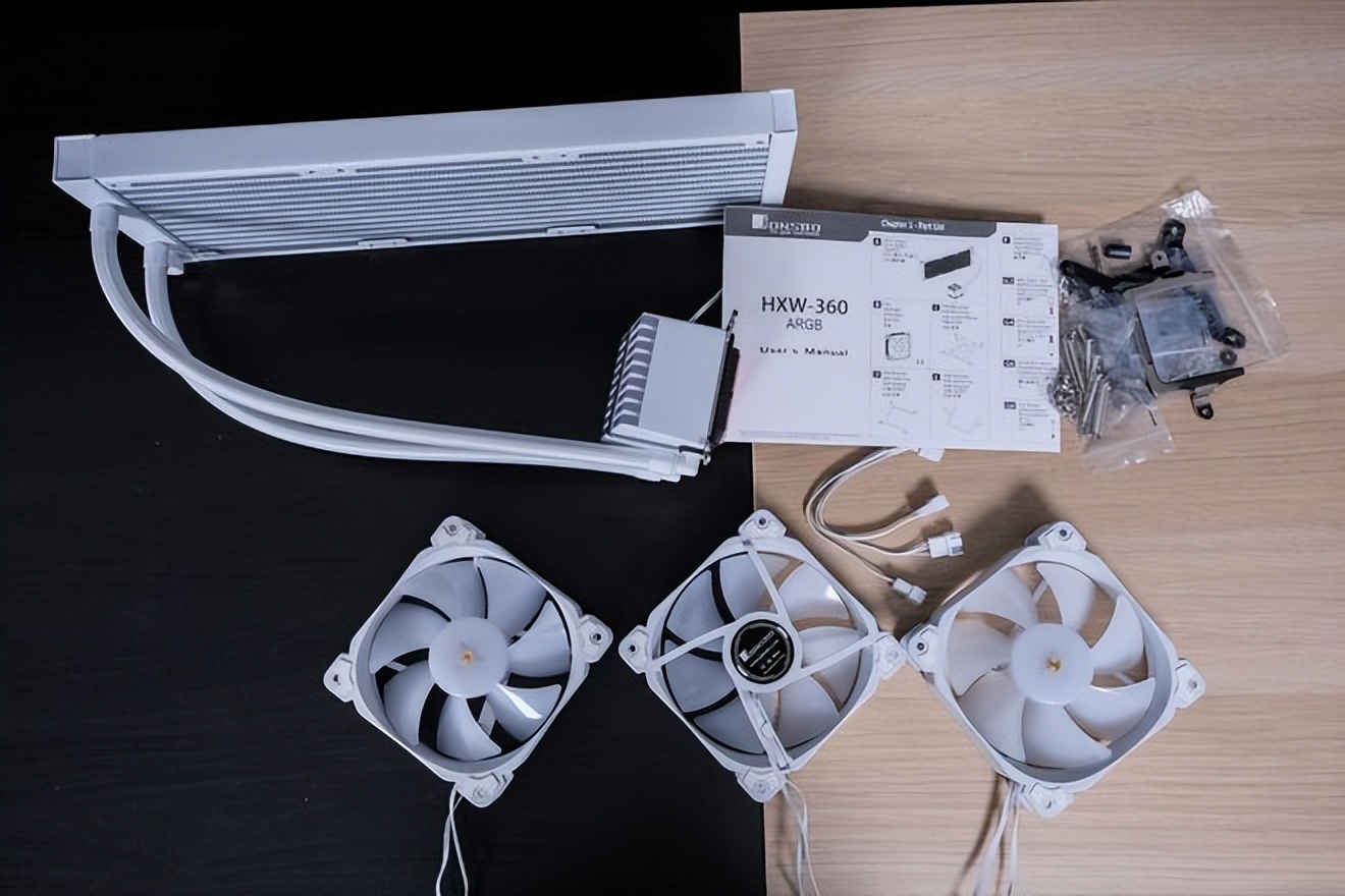 散熱方面是剛入手的HXW 360 ARGB一體式水冷,官方宣稱可以做到300W TDP的散熱能力。3個風扇和冷頭都支持ARGB,神光同步。