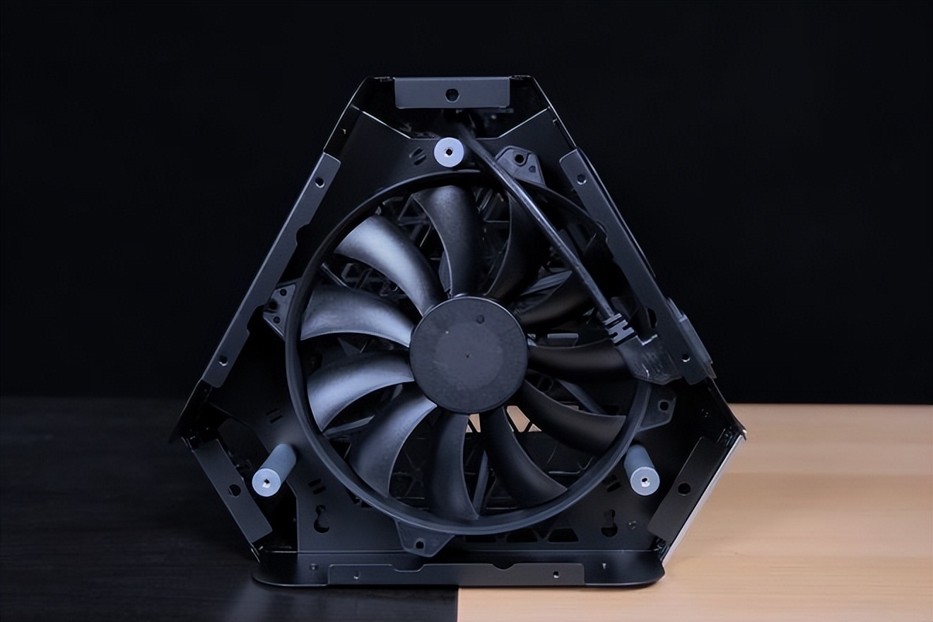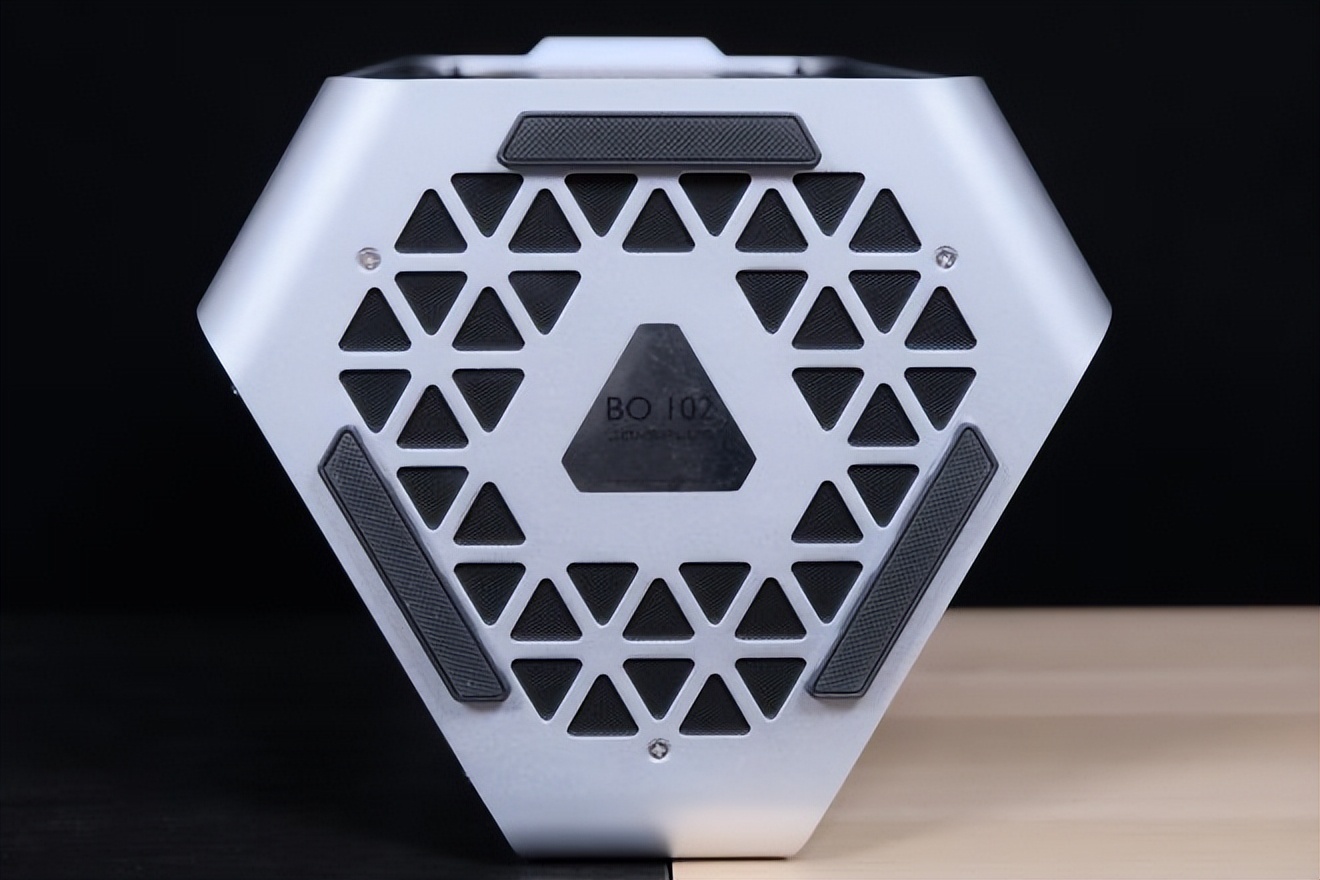 BO 102 整體以三棱角的形態呈現,非常規的三角形結構,把傳統機箱橫向伸展的部分利用三角形的3個面向上排布,極大的降低桌面的佔用面積,縱向上爲了兼容360尺寸的水冷散熱,高度也確實超出對ITX的預期,比中塔機箱都要高一些,但是在保證功能性完善的情況下,也充滿了足夠的視覺識別度。