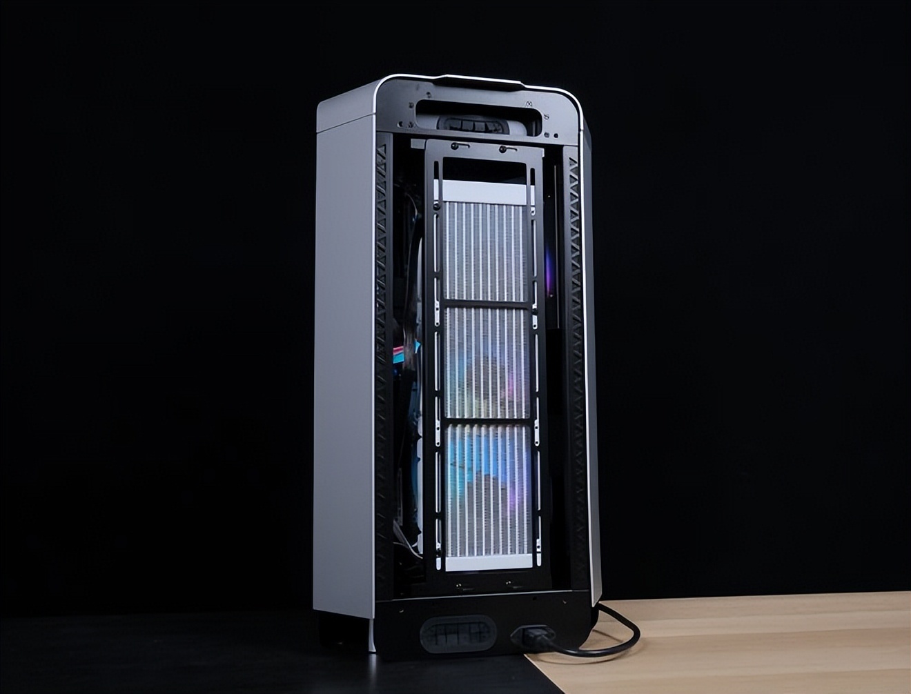 經過半天的折騰,終於把整機搞定,整機三面三倉,主板和電源上下排布,完美的容納ATX的電源,供電線纜剛好隱藏到下方空間中。水冷安裝這塊要根據實際使用的水冷冷頭形狀,水管的彎曲情況來調整方向,稍微要注意的是水冷管跨過內存延伸到另一側的冷排面,所以要留心一下安裝順序,避免來回拆裝。機箱兩側的棱角鋁板下有隱藏的垂直理線槽,巧妙利用這部分空間,將供電、風扇的供電、燈控線都藏到下面。