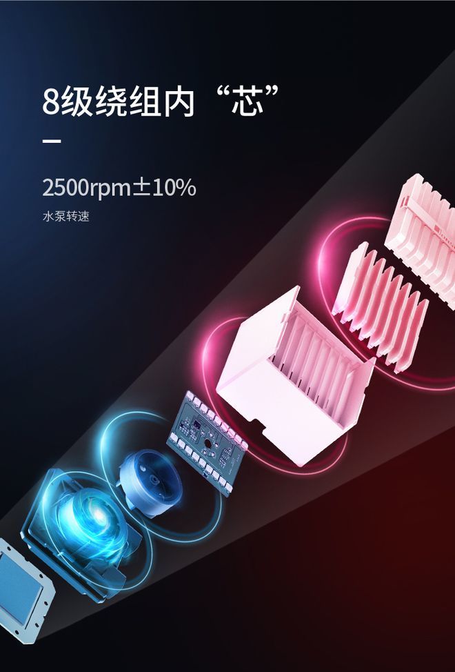 冷頭部分水泵採用8級繞組內芯,轉速2500轉左右,這點是高端水冷所具備的基本轉速水平,360的冷排和水管相對的水流阻力也更大,轉速是非常關鍵的性能衡量指標。