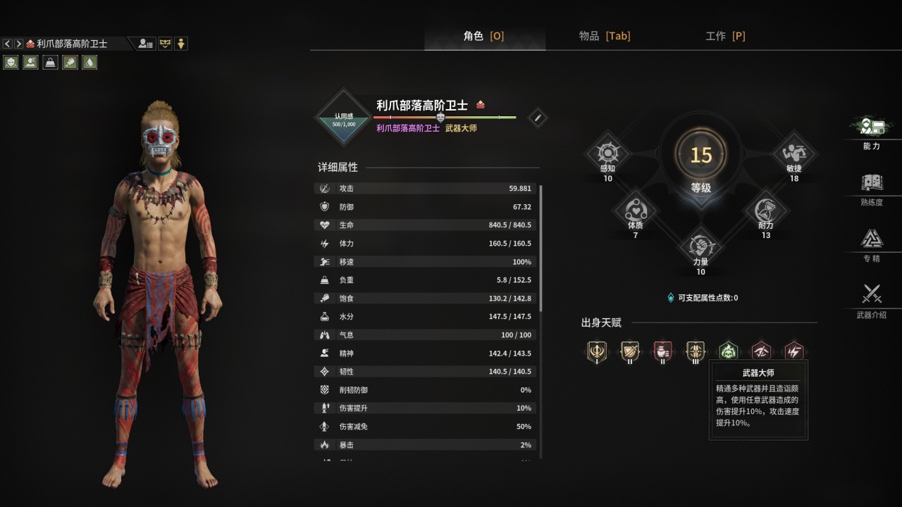 其次是族人的天赋特性,一些天赋特别好,比如“武器大师”——各种武器伤害和攻速都加10%,“夜行者”——在黑夜中移速提升10%,暴击提升5%,当然还有一些负面天赋,不过这些负面天赋很多影响并不大,而且在每5级的升级过程中有几率会洗掉。