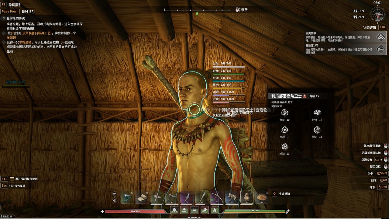 当然,收族人也是要看品质的,我们要点出来面甲页面的“素质评估”这个技能,以后遇到敌人时,长按“Q”就可以直接观察到他们的品质、称号(也能看动物),有一个预判,是杀还是抓,非常方便。