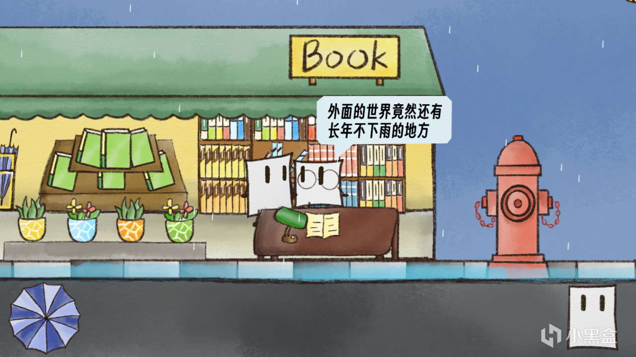 一张纸生活在常年下雨的小镇中,它每天下班回家都要用雨伞抵挡各处来的溅水,它真的很讨厌下雨。游玩时长在20分钟左右,游戏还在持续更新中,目前完成度60%。