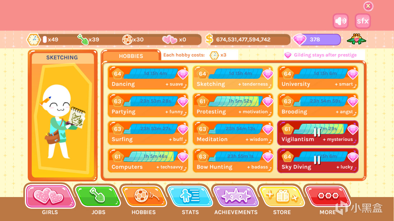 总体来说是一个很不错的放置类游戏。 不需要操作,不需要技术,只需要时间。 但如果你想第一遍就把所有妹纸的好感度刷到最高。 算了下至少需要上千年的时间。那这不是一个人类可以完成的任务。 因此,玩这个游戏的两个好帮手:更改windows时间 (不知道是不是所有人,反正我这里只能改到int32对应时间戳的上限2038年1月18日) + 修改内存 by.傲娇のkuma