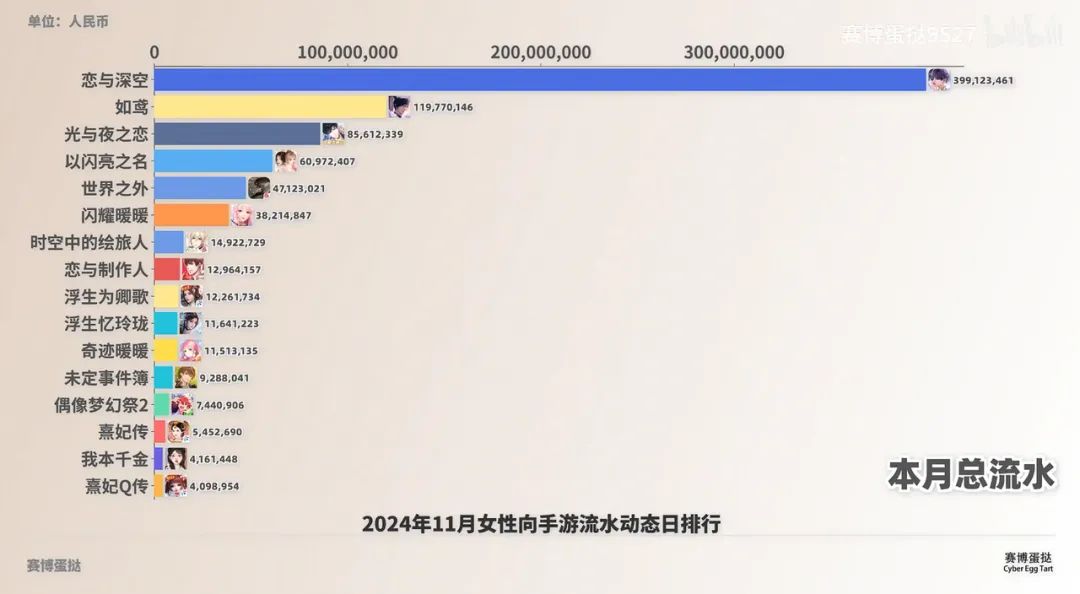 而且女性向遊戲的競爭本身正在白熱化。根據B站Up主“賽博蛋撻”的統計,今年11月,國產女性向手遊收入過億的有兩款,超千萬級的有11款。