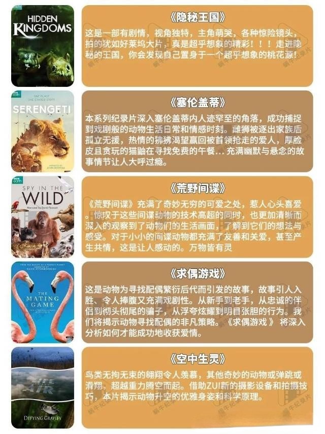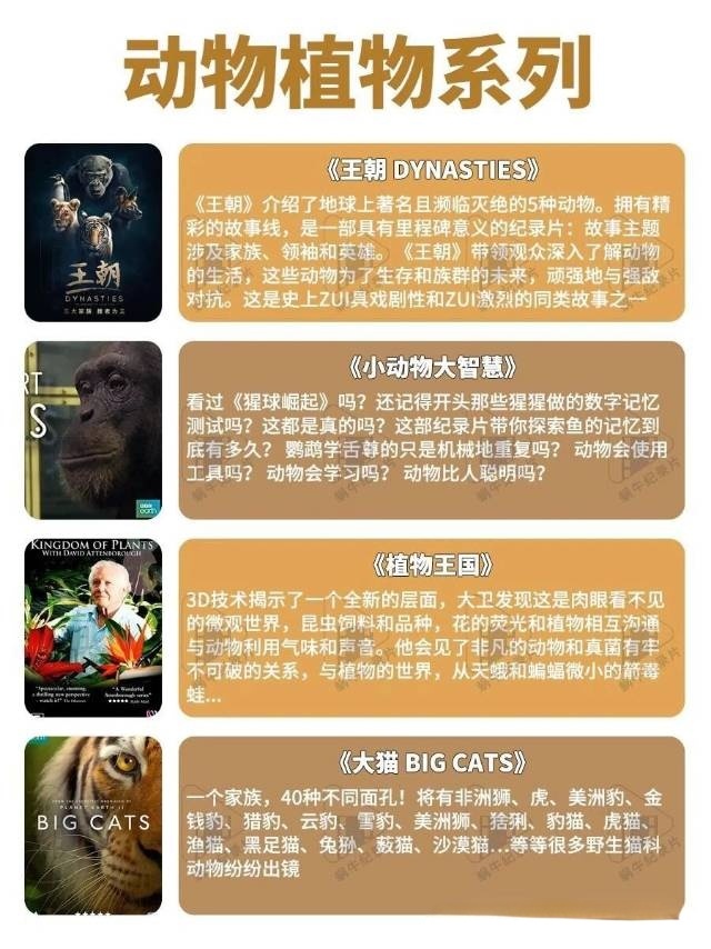 除此之外,《冰凍星球》聚焦極地地區,揭開南北極的神祕面紗。《王朝》則以獨特視角深入動物家族,展現它們的權力爭鬥、家族傳承。