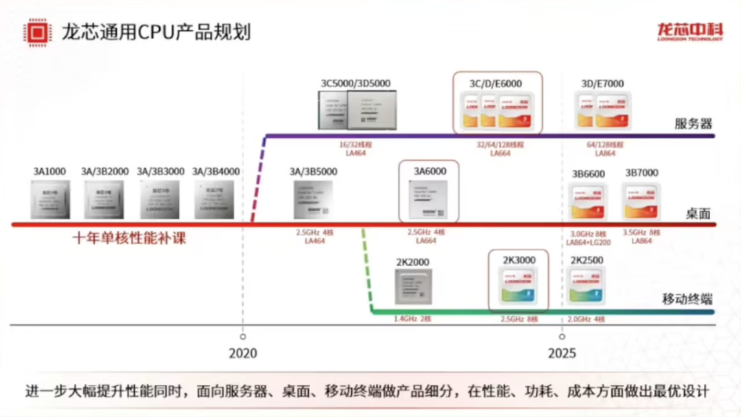而桌面端方面,目前正在研发下一代桌面端处理器 3B6600 与 3B7000 系列。根据龙芯中科 CPU 路线图显示,下一代龙芯桌面处理器将集成八个 LA864 核心,3B6600 主频为 3.0GHz,同时集成 LG200 核显;3B7000 主频可达 3.5GHz,具有丰富的 IO 接口,包含 PCIe4、SATA3、USB3、GMAC 和 HDMI 等。龙芯3B6600将使用更成熟的工艺,预计单核/多核性能可以达到中高端酷睿 12~13 代水平。