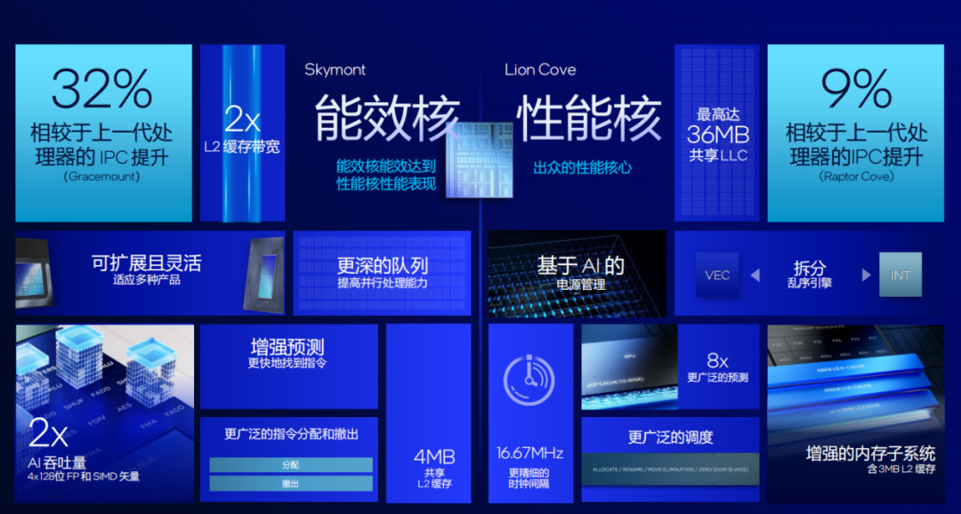 从架构来看,Arrow Lake-S的酷睿200S系列采用了全新Chiplet设计,性能核与能效核的IPC都得到了大幅提升,Intel还很大胆的砍掉了超线程,增加了L2缓存容量,内置的GPU也升级到了Xe核心,甚至还加入了用于AI的NPU核心。