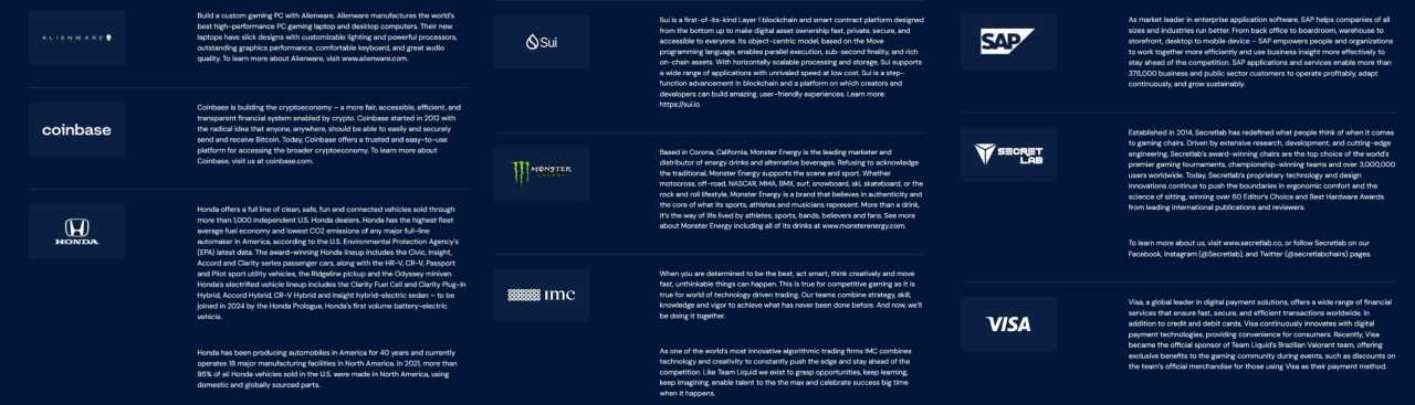 根據其官網顯示Liquid目前有9家贊助商:外星人電腦、加密貨幣Coinbase、本田、區塊鏈Sui、魔爪、互聯網技術IMC、軟件公司SAP、SecretLab電競椅、VISA