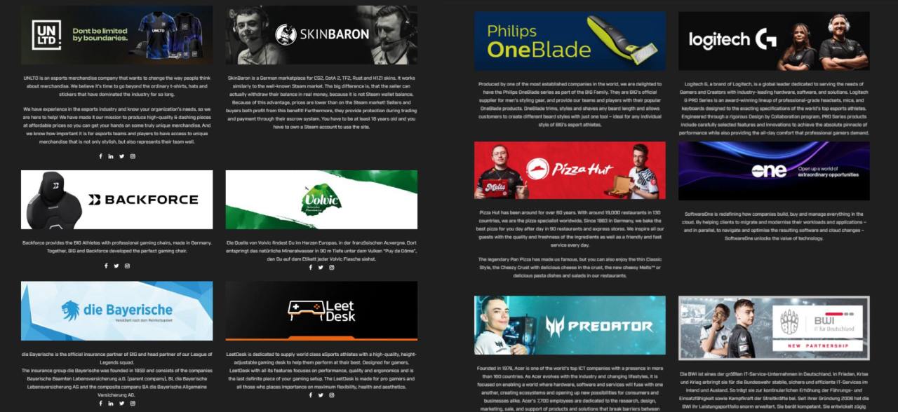 BIG有12家贊助商:電競周邊UNLTD、德國皮膚飾品交易SkinBaron、背力電競椅、Volvic礦泉水品牌、保險公司die Bayerische、遊戲桌品牌LeetDesk、飛利浦剃鬚刀、羅技、必勝客、互聯網技術公司SoftwareOne、宏碁掠奪者、德國最大IT服務公司之一BWI