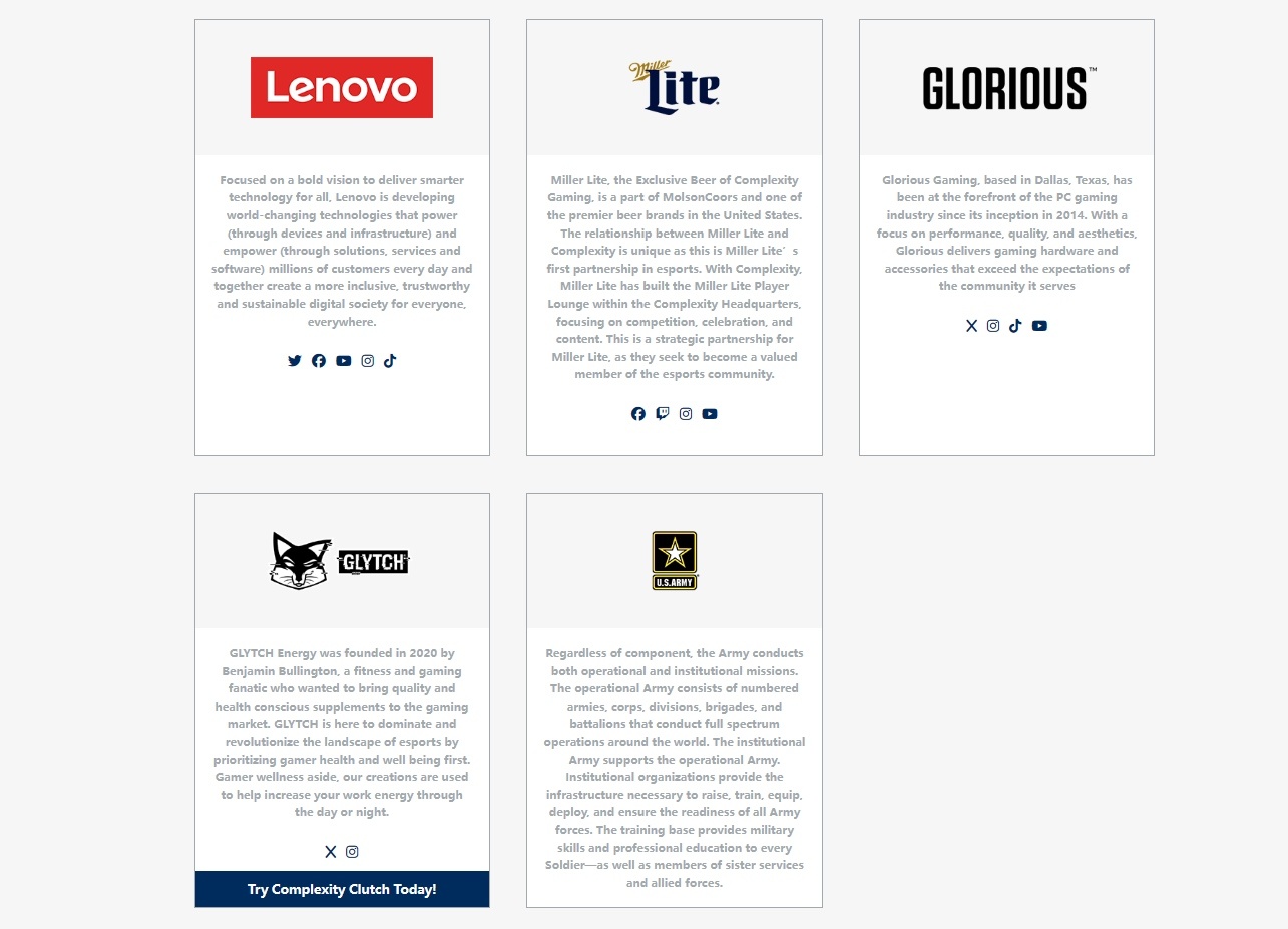 根據官網顯示它擁有5家贊助商,分別是:聯想、9品牌MillerLite、電腦配件與外設Glorious、健身食品GLYTCH、美國陸軍U.S.Army