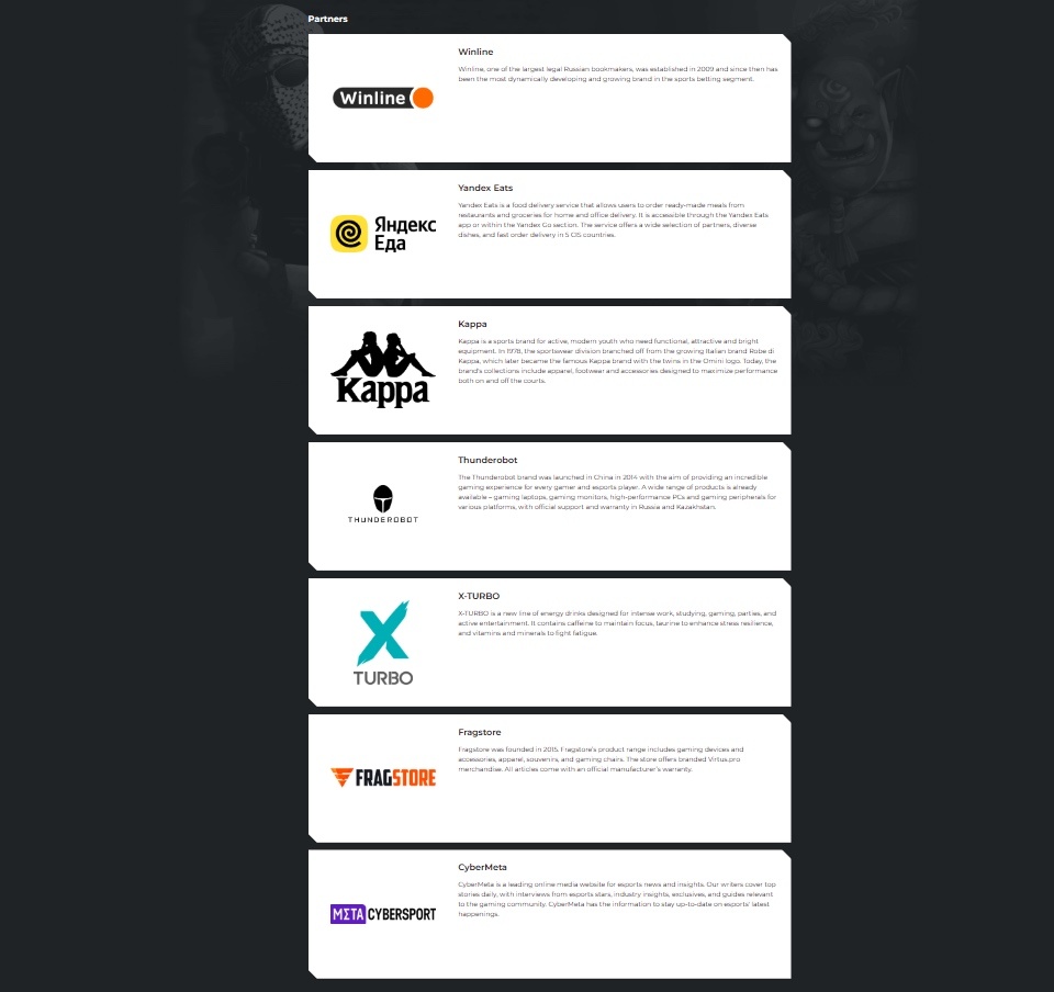 根據其官網顯示,VP擁有7家贊助商,他們分別是:第一個不能多說那種、服務5個獨聯體國家的外賣平臺Yandex、背靠背Kappa、中國的雷神電腦品牌、能量飲料TURBO、爲VP提供周邊的Fragstore、電競媒體CyberMeta