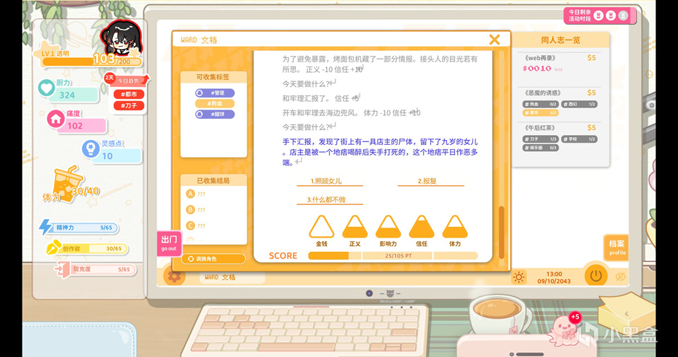 先說模擬經營玩法,不同於純粹的模擬遊戲,本作採用的是限制頗多的AVG模擬經營玩法,除了不需要消耗點數的買賣穀子、佈置痛房和扎痛包外,玩家每天只有三次行動機會可以用來出門購物、尋找靈感和居家寫作。