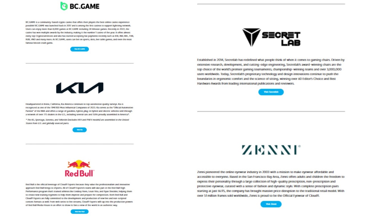 官网显示C9拥有5家赞助商:菠菜BC.Game、起亚美国、红牛、SecretLab电竞椅、眼镜行业Zenni