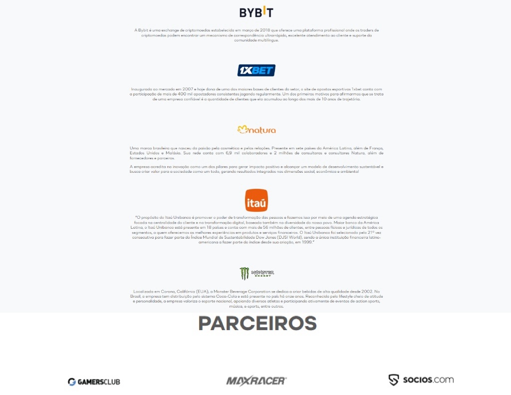 根据其官网信息显示,拥有5家赞助商和3家合作伙伴,他们分别是:加密货币Bybit、1XBET、巴西护肤品牌Natura、拉丁美洲最大银行Itaú、魔爪、