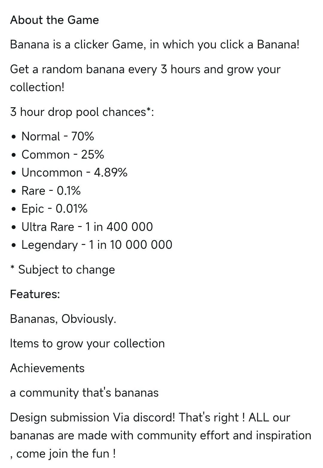 當然,你要是隻是爲了賺錢。你甚至都不用點擊這個香蕉。因爲官方特地告訴過玩家,遊戲打開一分鐘後,每過3小時就可以收集一根香蕉;打開一小時後,遊戲解鎖稀有香蕉掉落權限,每隔18小時就可以收集一根稀有香蕉。然後,你就可以躺着收香蕉了!(當然,收到香蕉後,以示尊敬,還是需要點一下游戲的)