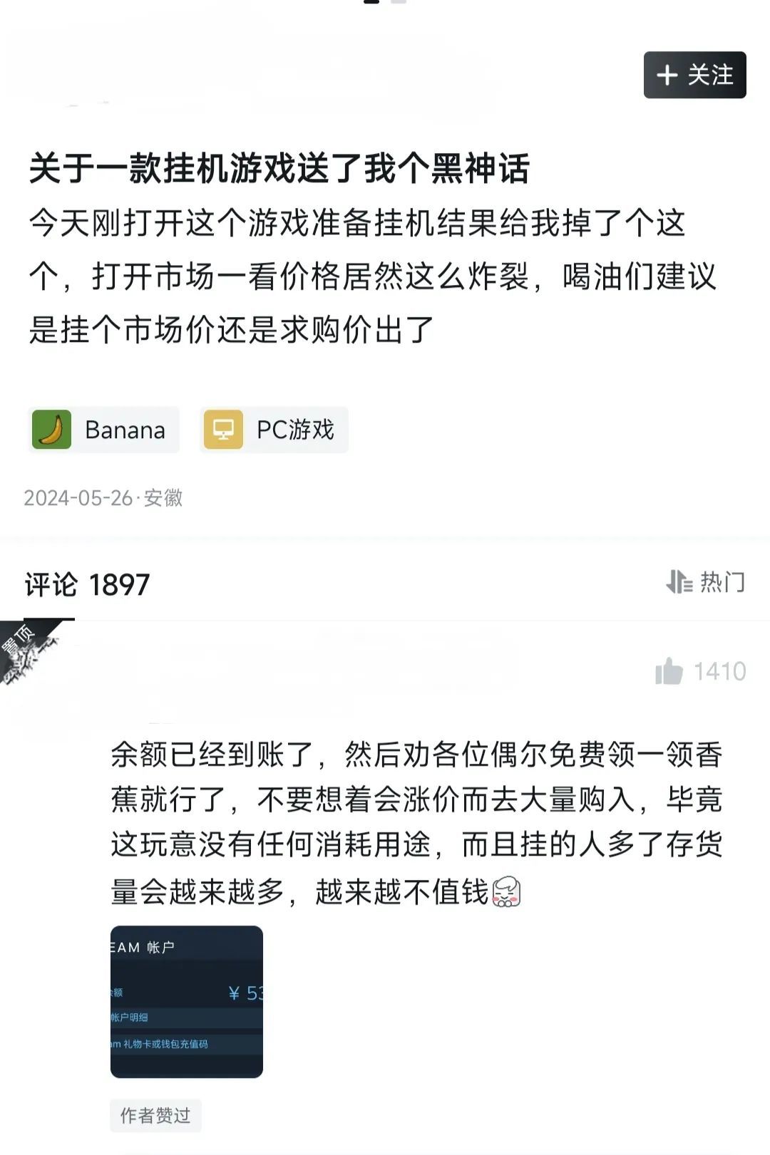 在今年的5月份,一個帖子《關於一款掛機遊戲送了我個黑神話》出現了小黑盒之中,配圖上是金光閃閃的大香蕉和這款大香蕉的售價。