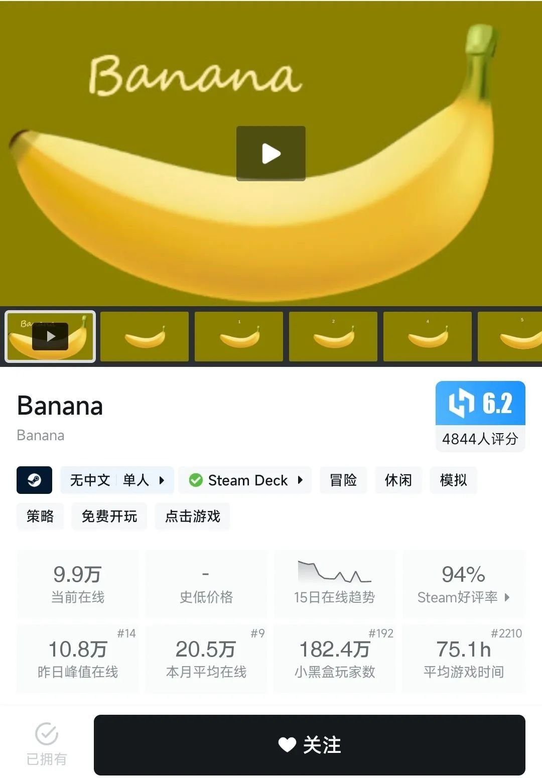 但,說真的兄弟,這到底是什麼?賽博香蕉?一款遊戲?爲什麼能成爲倒狗們的最愛?並且遊戲在短時間內一躍成爲全球在線榜第三?難道這個香蕉會和《csgo》的飾品一樣,有着很大的市場和需求?