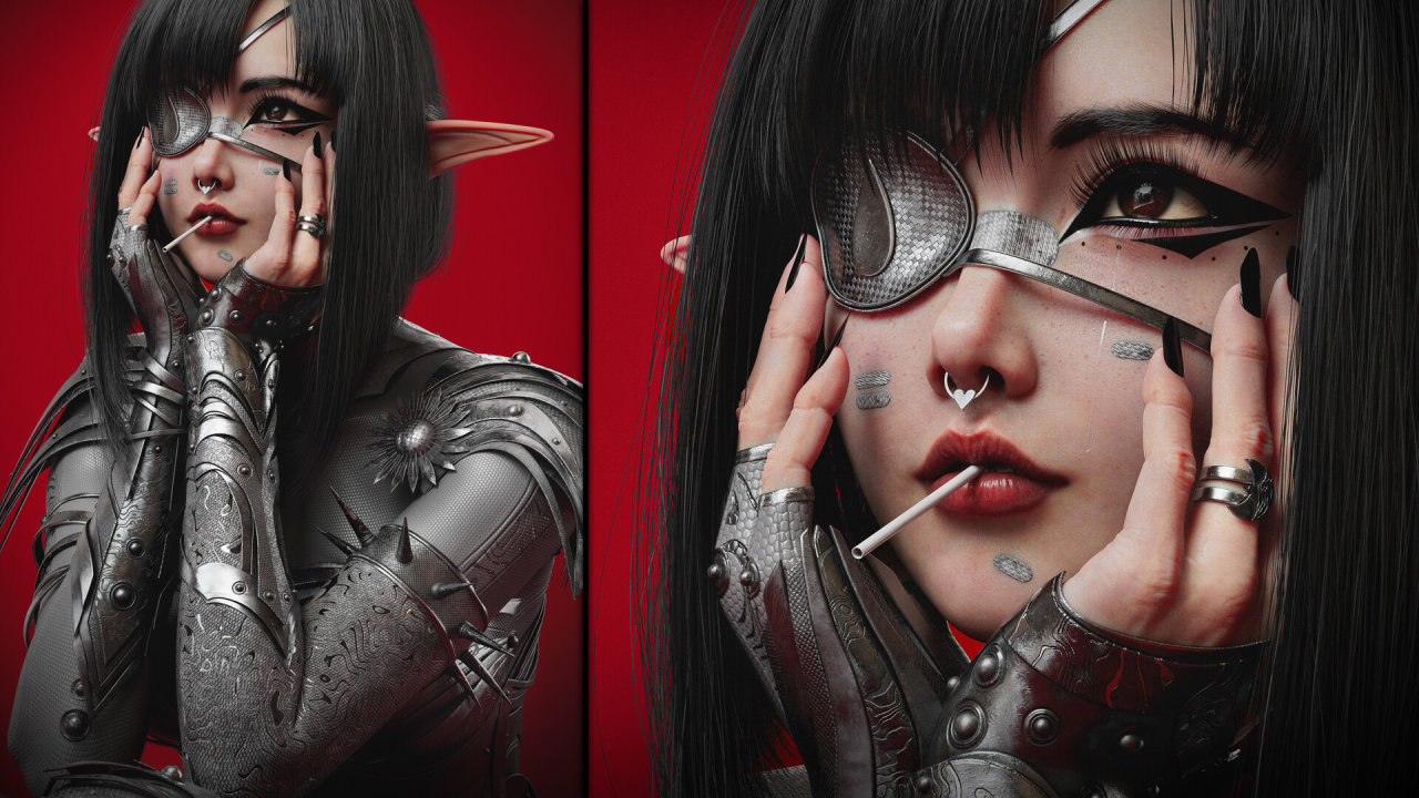 白色短髮,戴着黑色眼罩(外表看起來是眼罩,但其實是軍用目鏡),身穿黑色哥特風連衣裙,腳穿黑色過膝高跟皮靴。