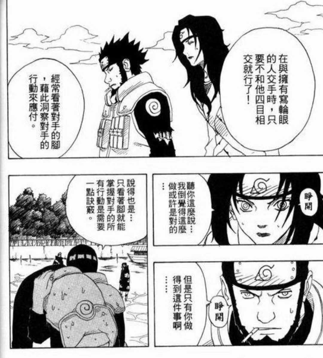 在《火影忍者》中,凱在和擁有寫輪眼的對手交戰時,爲了避免和對手四目相交,他通過看對手的腳,藉此洞察對手的行動來應付。