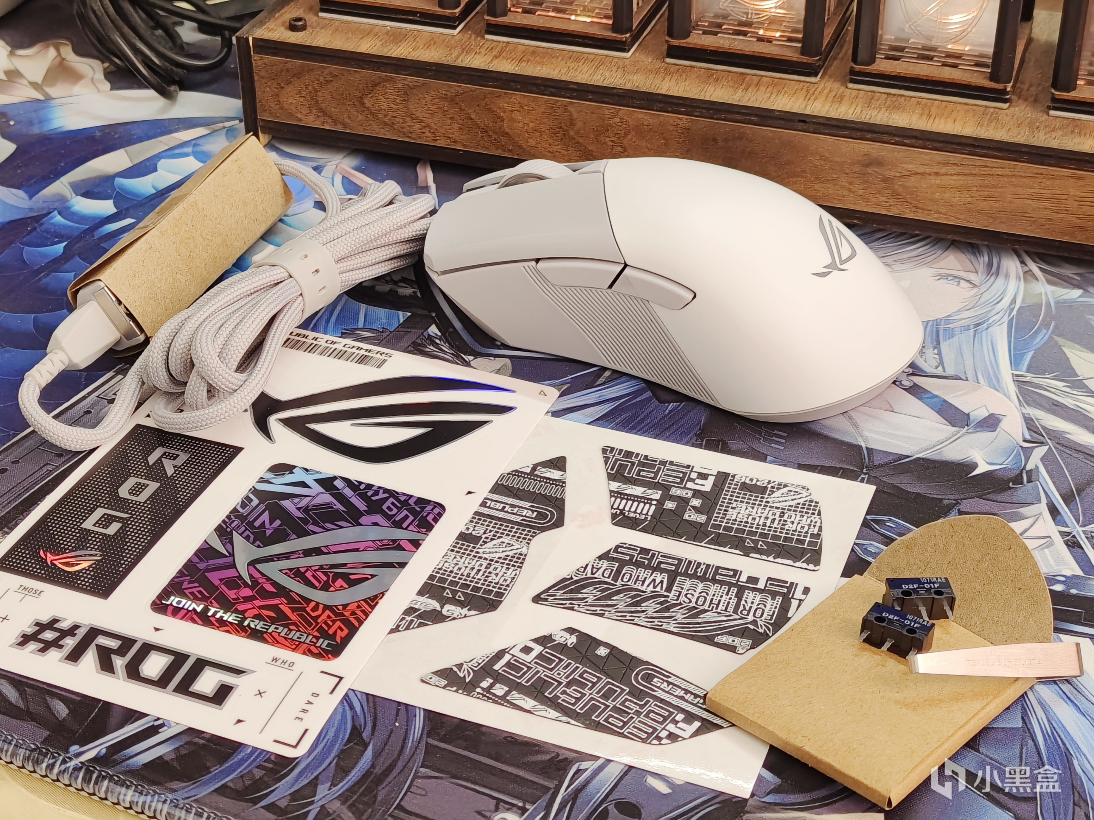 配件与月刃无线 AP 36k相同,都赠送了防滑贴,黑白设计挺好看的。还有可供更换的备用微动和备用脚贴以及ROG的信仰贴纸,还有一根非常舒服的伞绳线,这伞绳线比卓威强。