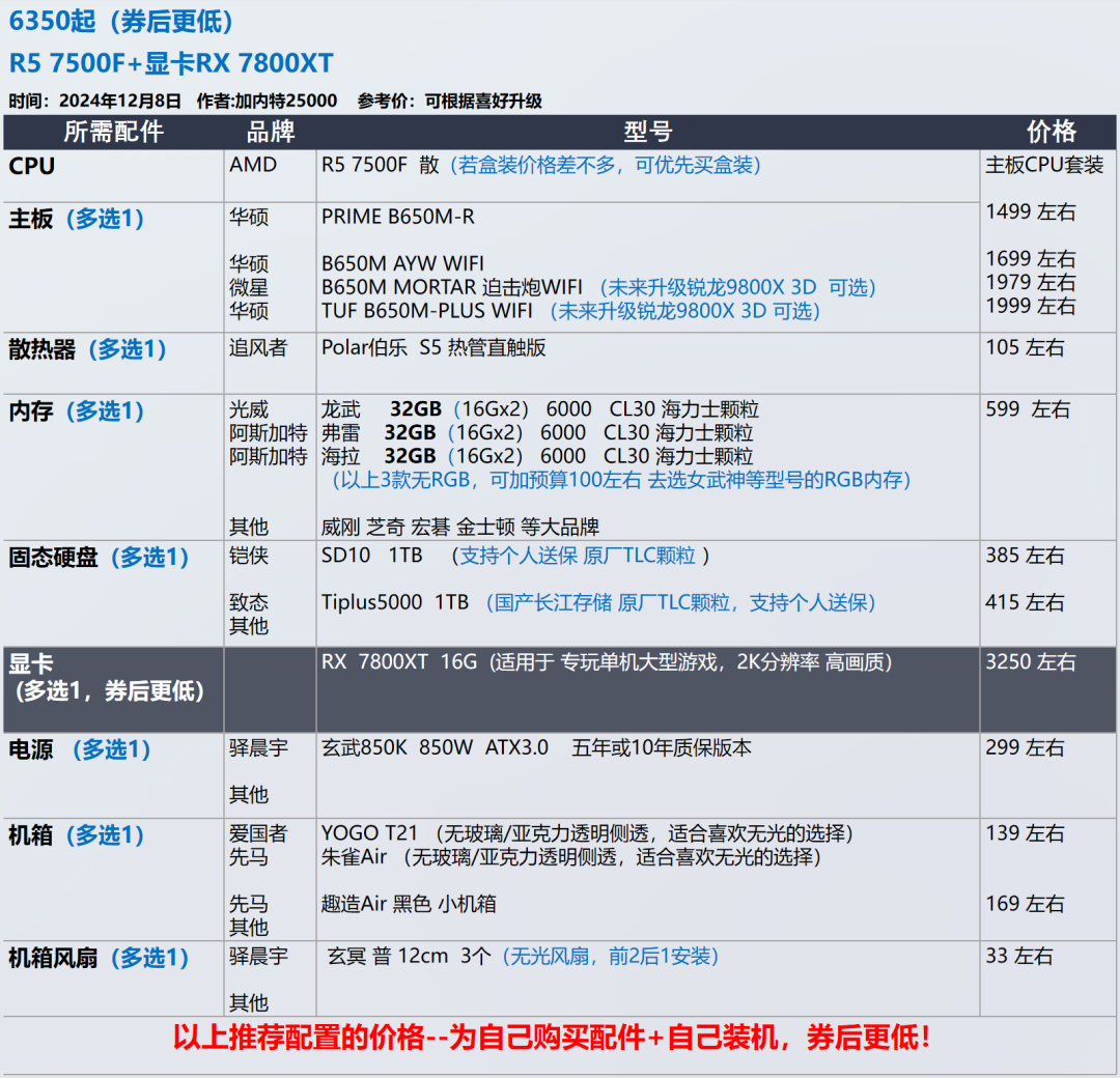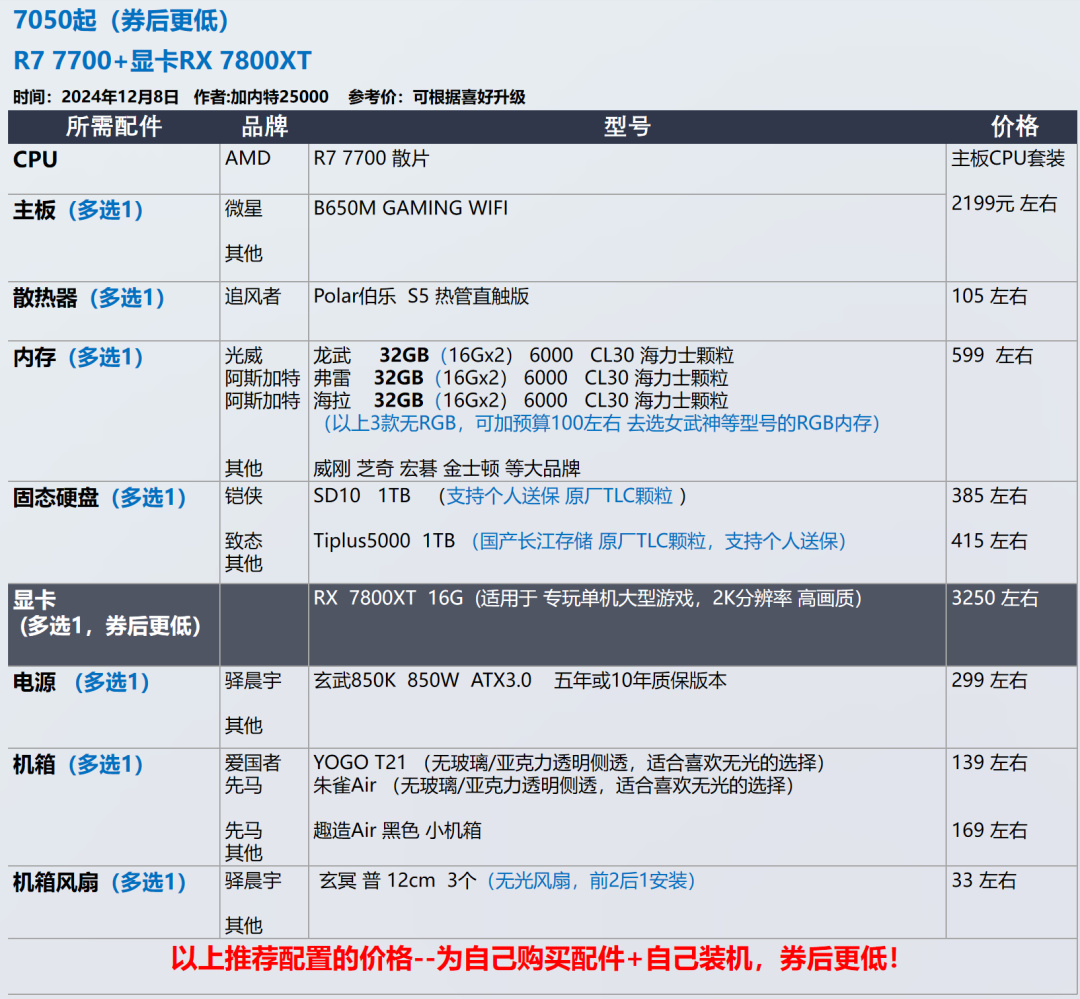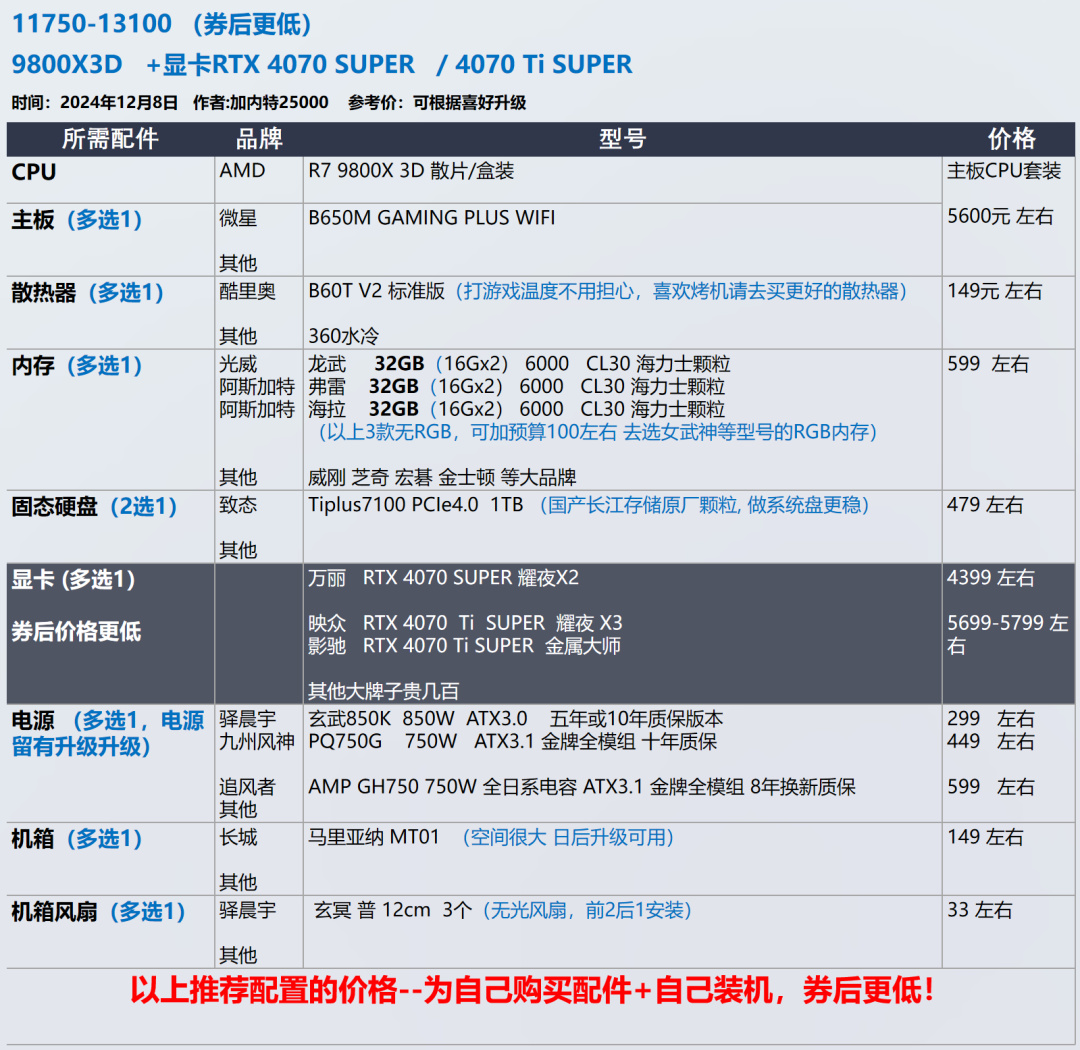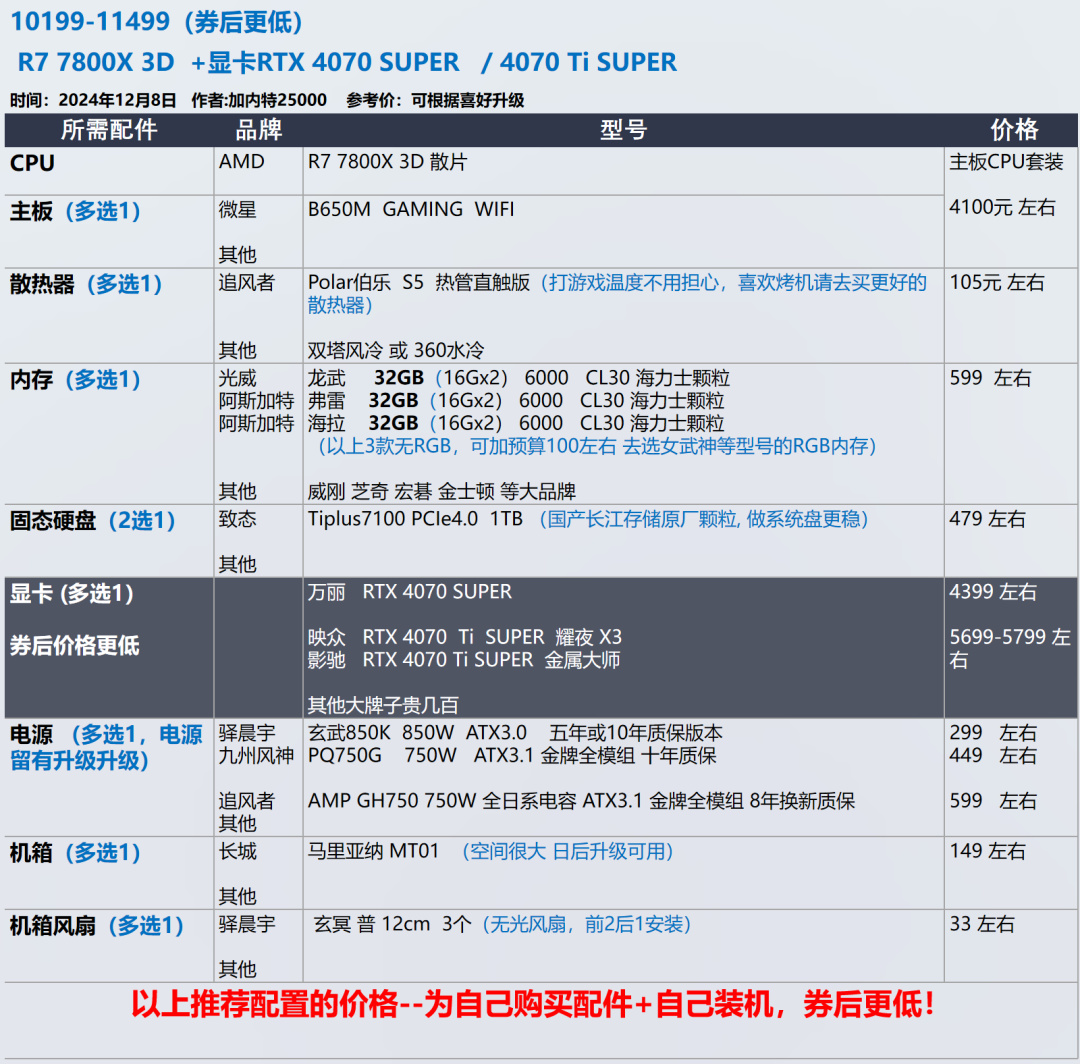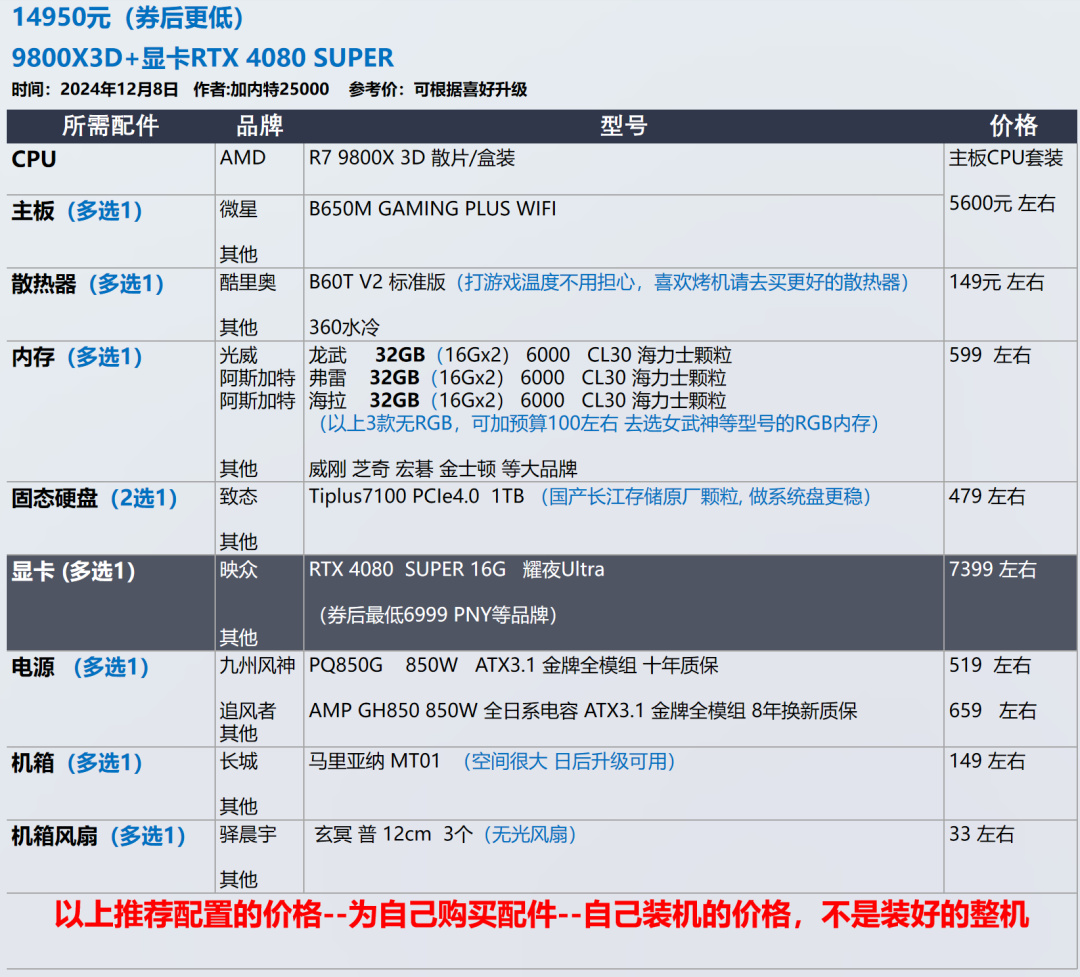 後2套配置7800X3D 9800X3D漲價太多,目前不建議購買