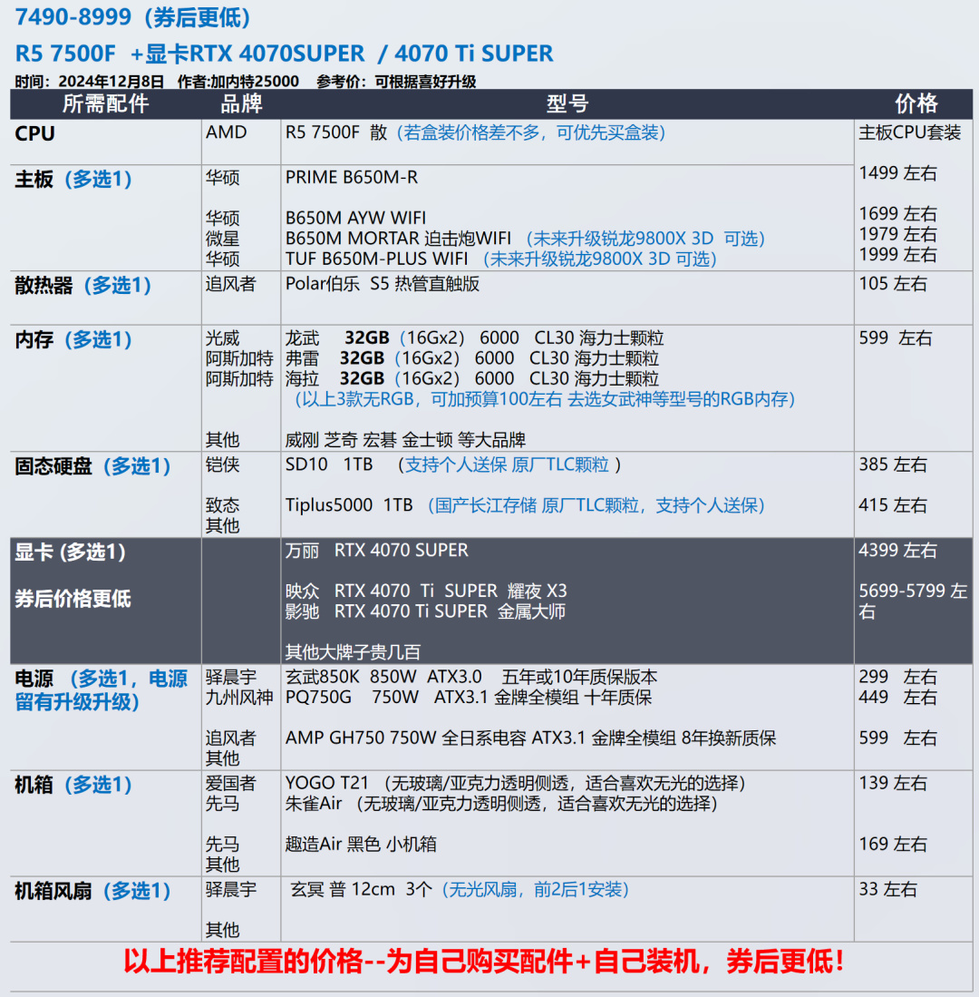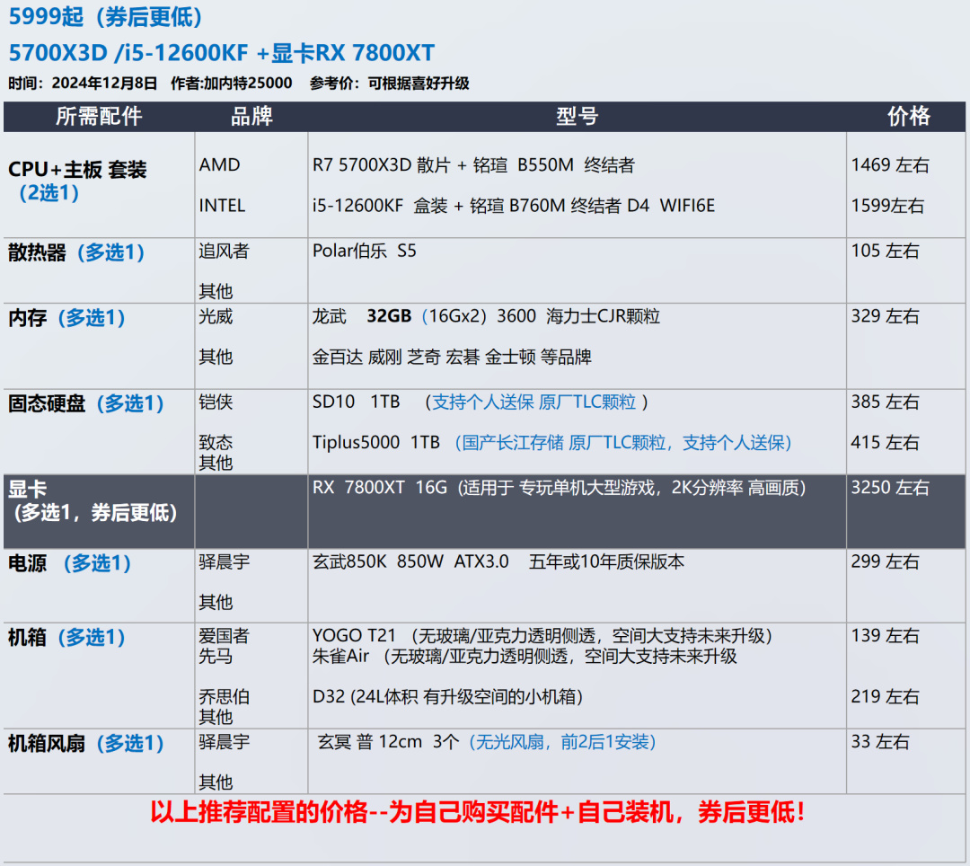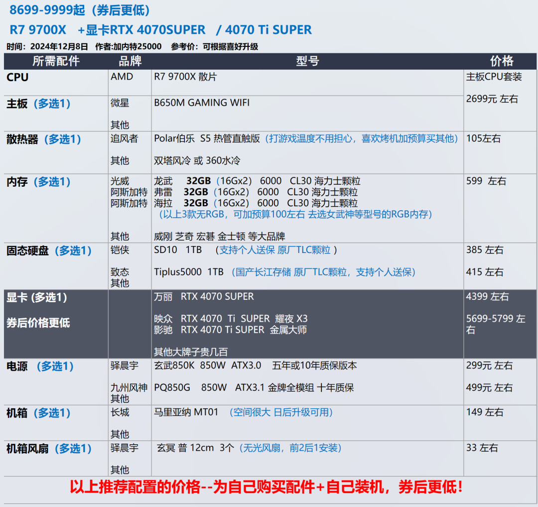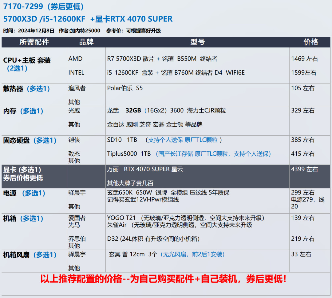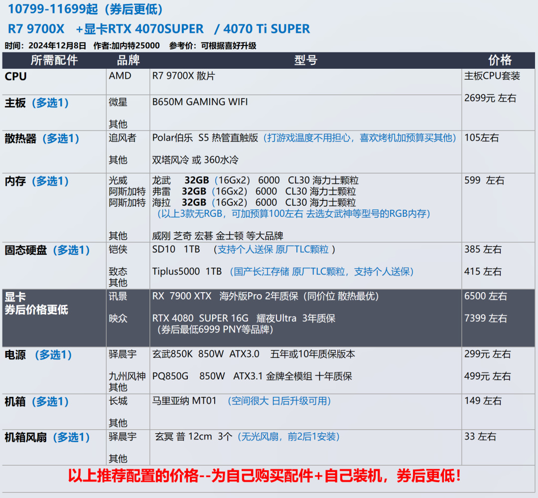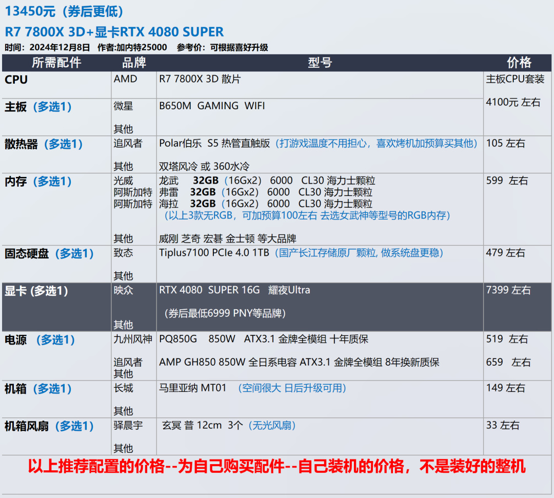 後2套配置7800X3D 9800X3D漲價太多,目前不建議購買