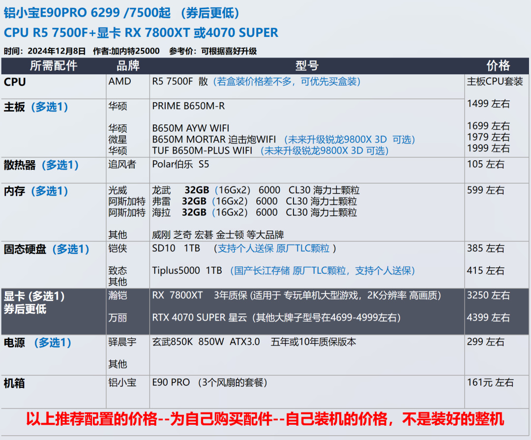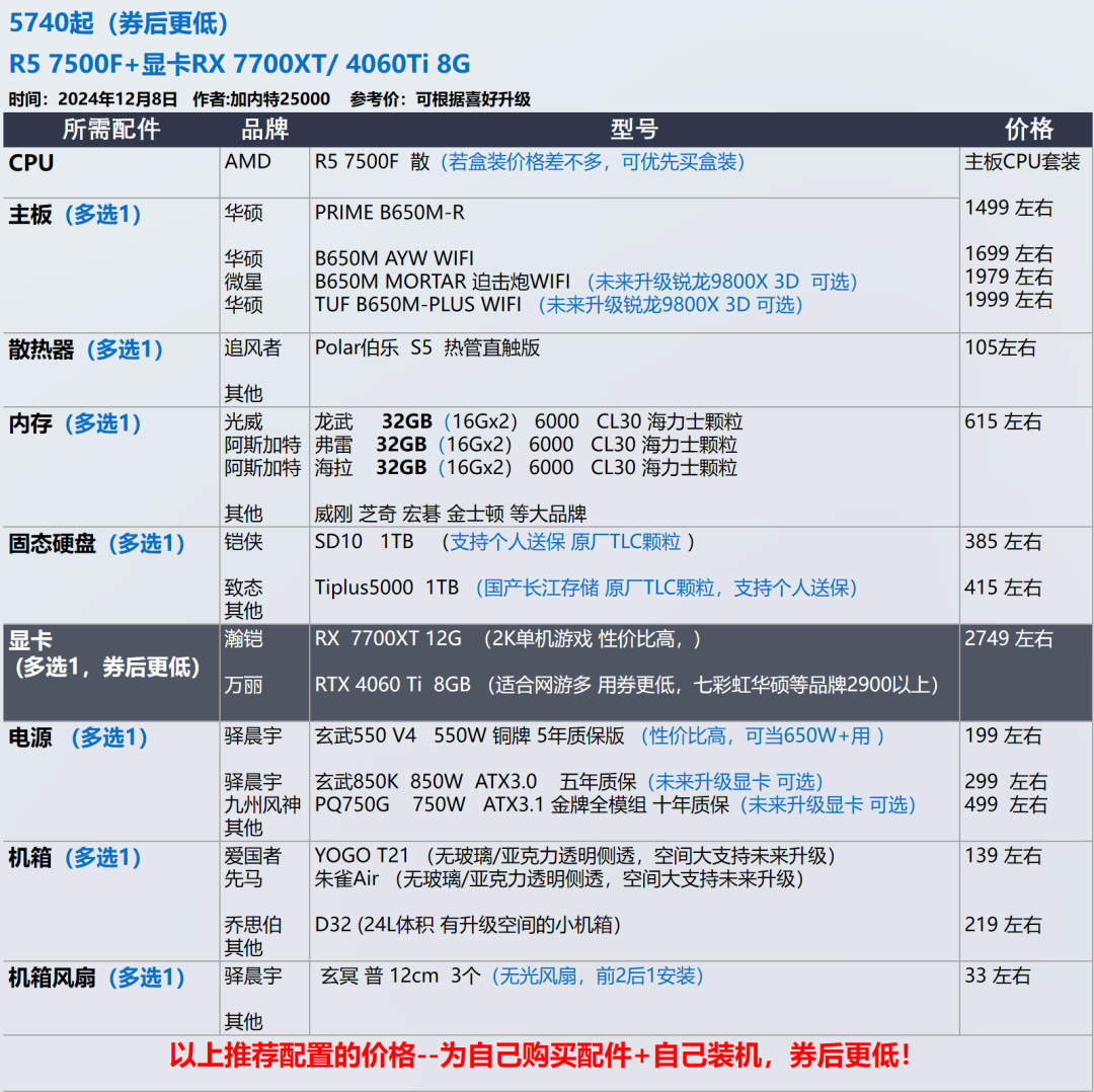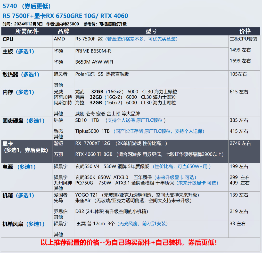 前2套配置,主玩單機遊戲 R5 7500F R7 7700搭配顯卡RX 7900XTX RTX 4080SUPER帶4K無壓力,未來也可以等銳龍9000系降價,升級CPU。