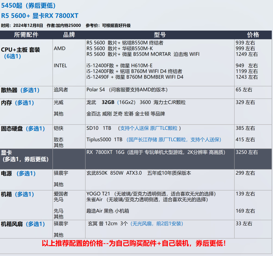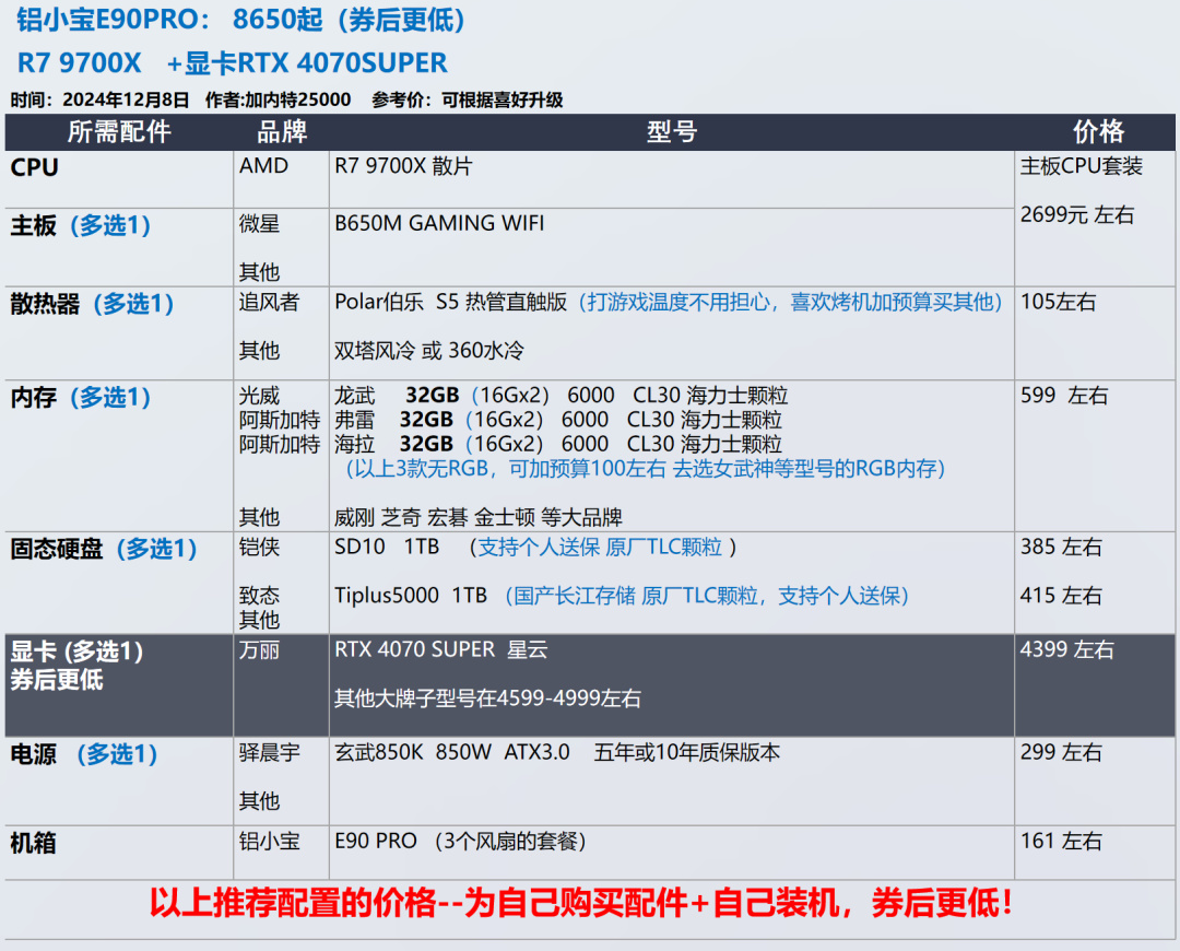 我先疊個甲,本文配置表中的配件無恰飯無廠家合作,建議盒友可根據喜好調整升級!