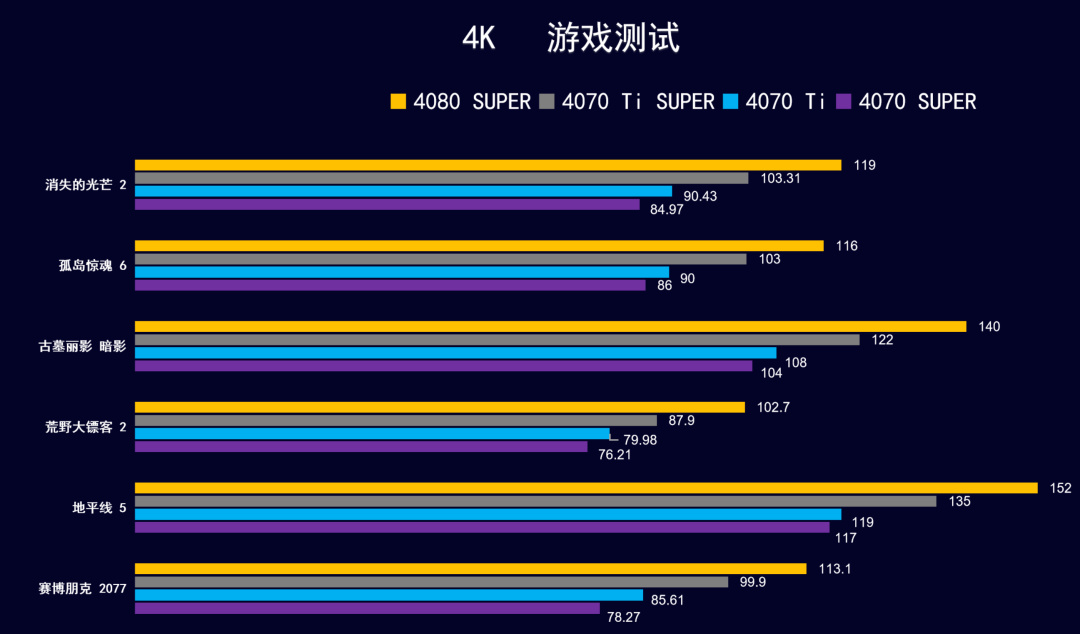 在12GB顯存夠用的情況下,2K分辨率打遊戲4070 Ti SUPER僅領先4070Super 9%左右(4070 SUPER遊戲性價比更高一點)