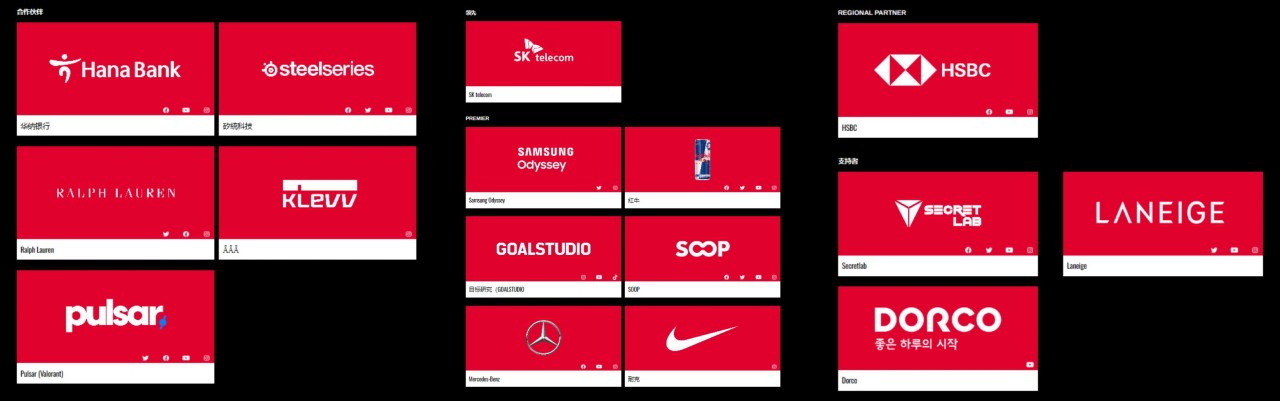 拖隔壁英雄聯盟的福,T1的贊助商目前有16家,他們分別是:韓國最大外匯銀行韓亞銀行、賽睿、世界上最廣爲人知的消費品牌之一的拉爾夫勞倫、科賦存儲、派世外設、韓國最大財閥之一SK集團的電信運營商SKtelecom、三星Odyssey、紅牛、服飾品牌GOALSTUDIO、SOOP、奔馳、耐克、滙豐銀行、SecretLab電競椅、護膚品牌Laneige、剃鬚刀品牌Dorco