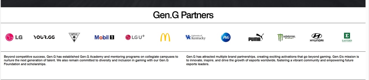 根據官網顯示GEN擁有12家贊助商,分別是:LG、電競數據平臺YOUR.GG、電腦硬件品牌TurtleBeach、美孚潤滑油、LGU+、麥當勞、美國肯塔基大學、全球最大日用消費品巨頭之一寶潔集團、彪馬、魔爪、現代汽車、美國東密歇根大學