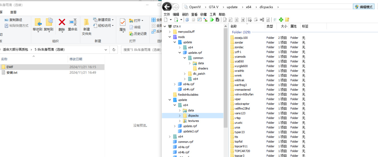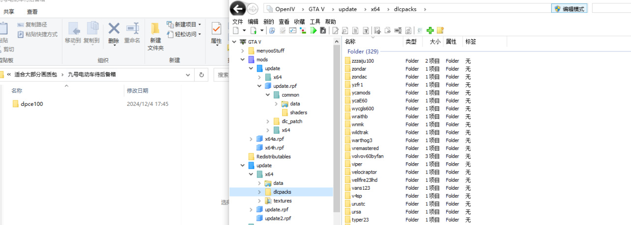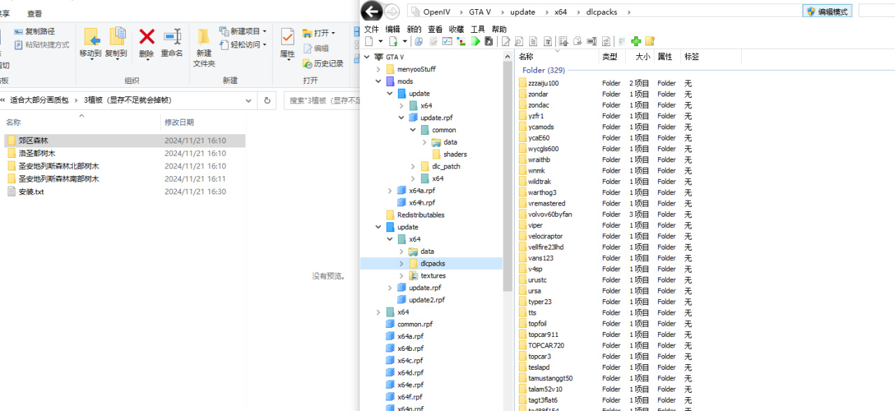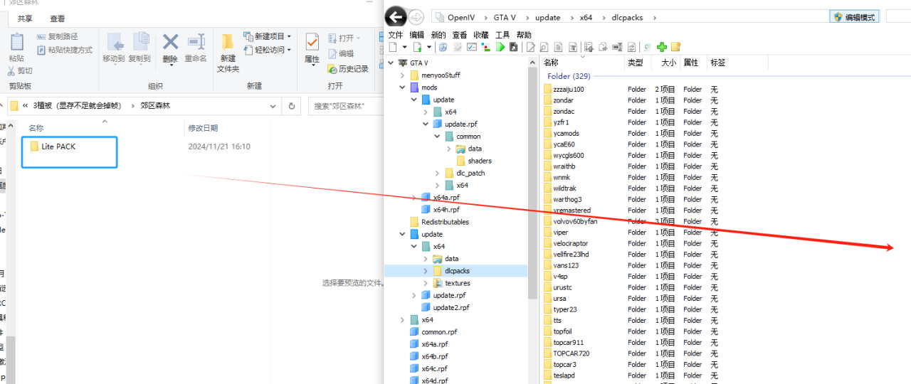 5、接下來就是植被的,和以上兩個安裝方法不一樣,在openiv找到Grand Theft Auto V\update\x64\dlcpacks路徑