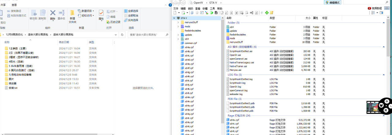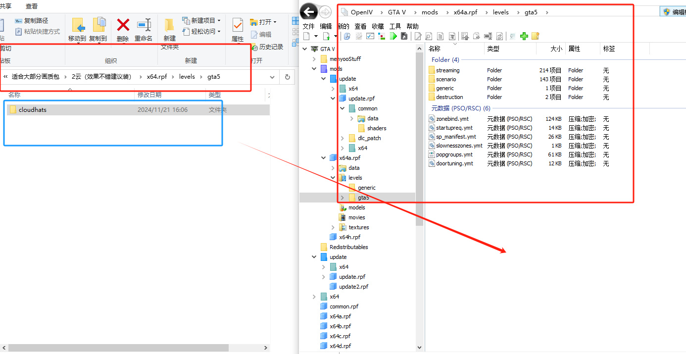 4、接下來就是打開雲(效果不錯建議裝)\x64.rpf\levels\gta5路徑,,然後在openiv找到路徑Grand Theft Auto V\mods\x64a.rpf\levels\gta5,將我畫藍框的拉進去openiv路徑