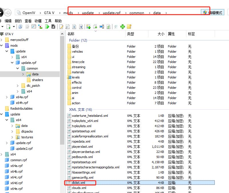 7、找到路徑\Grand Theft Auto V\mods\update\update.rpf\common\data,然後右擊dlclist編輯