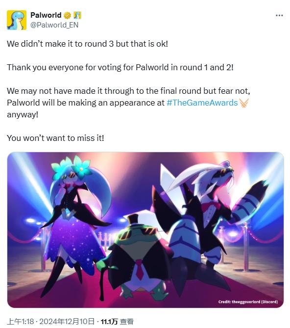 《幻兽帕鲁》官方发文宣布,虽然没有能够进入2024 TGA“玩家之声”投票的最后一轮,但会出现在TGA颁奖典礼上,并带来“玩家不想错过的消息”。《幻兽帕鲁》此前已经宣布将于12月上线一个大型内容更新,为游戏添加一个新的“神秘之岛”和大量其他内容,《幻兽帕鲁》可能会在TGA颁奖典礼上宣布该更新的具体上线时间。