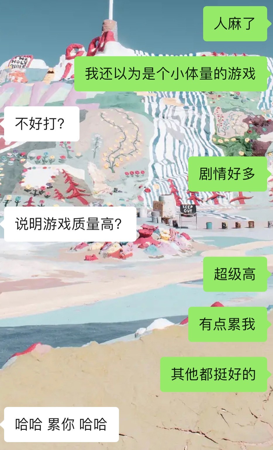 我跟朋友说这个游戏好玩,但是有点累我。对方除了觉得好笑,并没有说过多的话。他并不能理解我在玩游戏时把每一位NPC都当成朋友,想要竭尽全力去了解TA们的心情。
