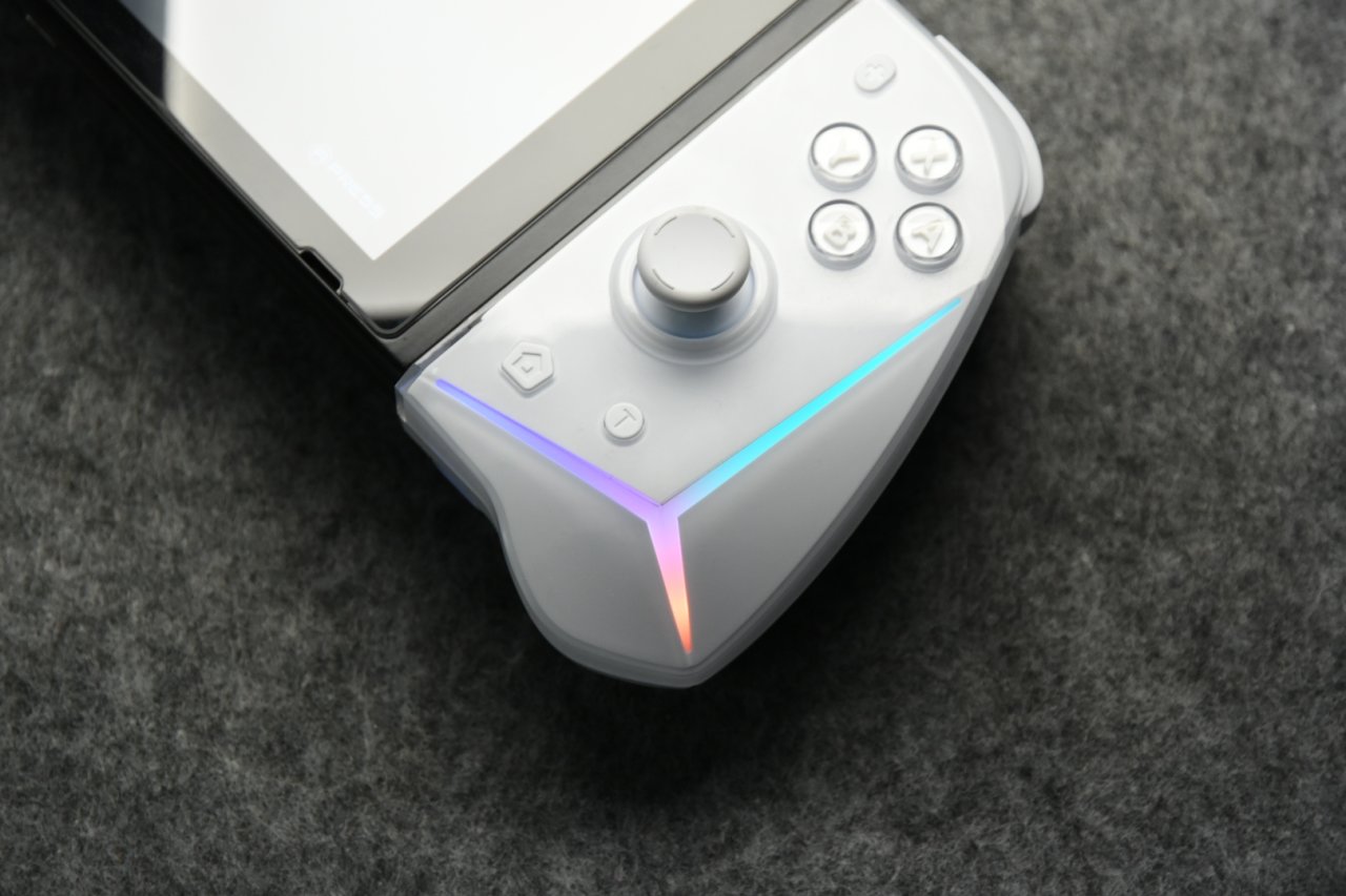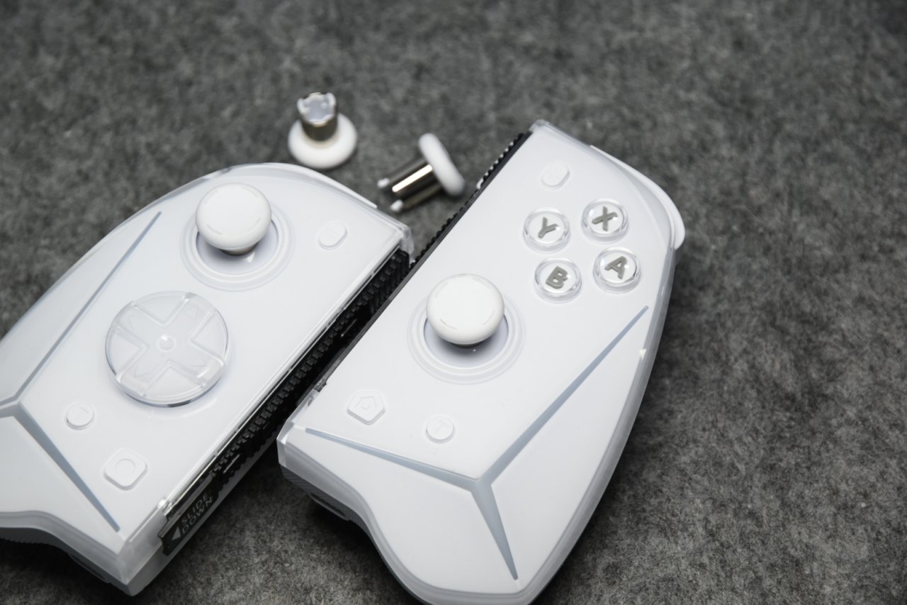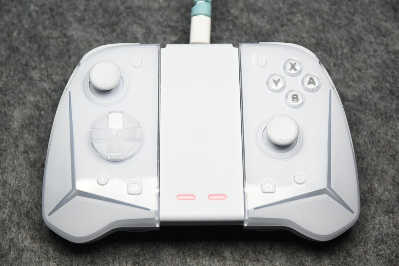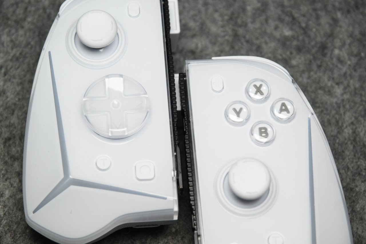 手柄的外觀與往常的分體手柄有些不同,科技感的味道更加濃厚,尤其是左右兩側的Y字大燈,搭配Switch之後,更像一臺win掌機。透明的前殼增加掌機的質感,雖然看上去好像支持拆卸,但其實不支持。