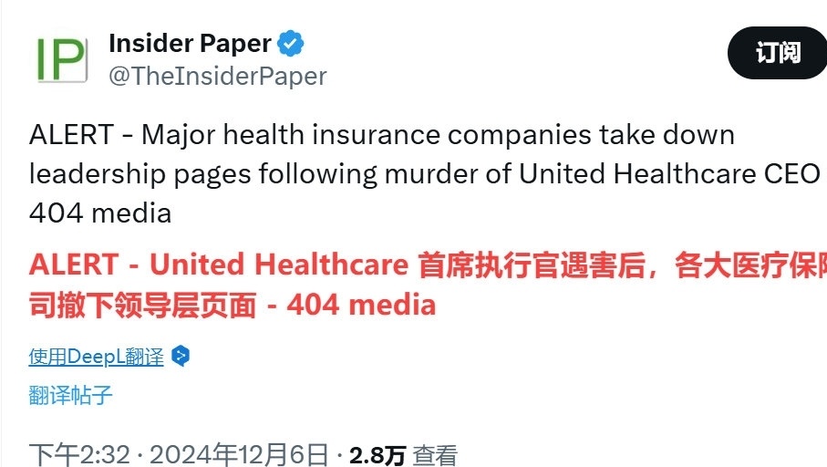 现在,对于美国的医疗保险行业,处于舆论中心的企业自然有种紧张感,多张领导人人像在这次风波中在官网下架,仿佛就是被这位“执行人”敲响了警钟!