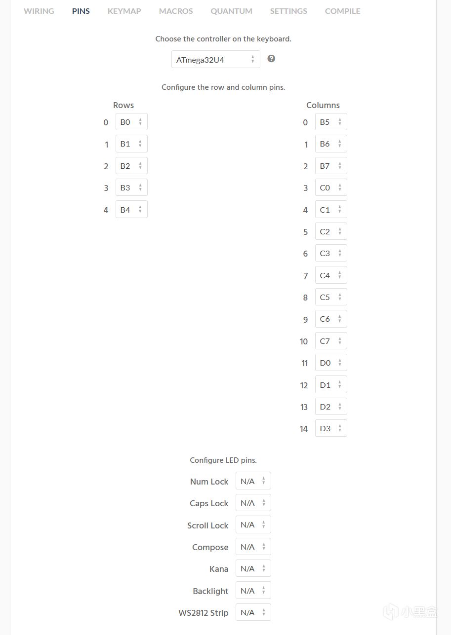 來到pins這裏設置主控型號和行列的引腳,主控選32u4,儘量別用led,能省點引腳