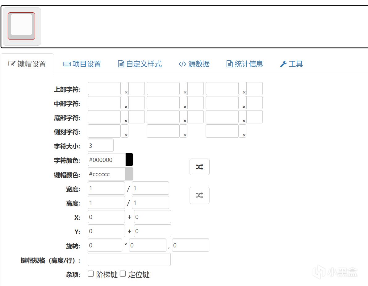 這裏可以編輯鍵帽左上、上、右上;左、中、右;左下、下、右下以及側刻的左中右,默認字符位置爲左上,側刻字符對於後續固件生成沒用,下面的字符大小字符顏色鍵帽顏色沒用