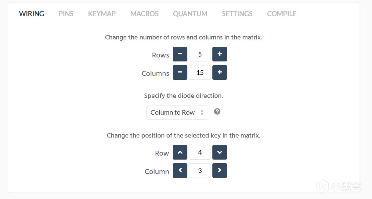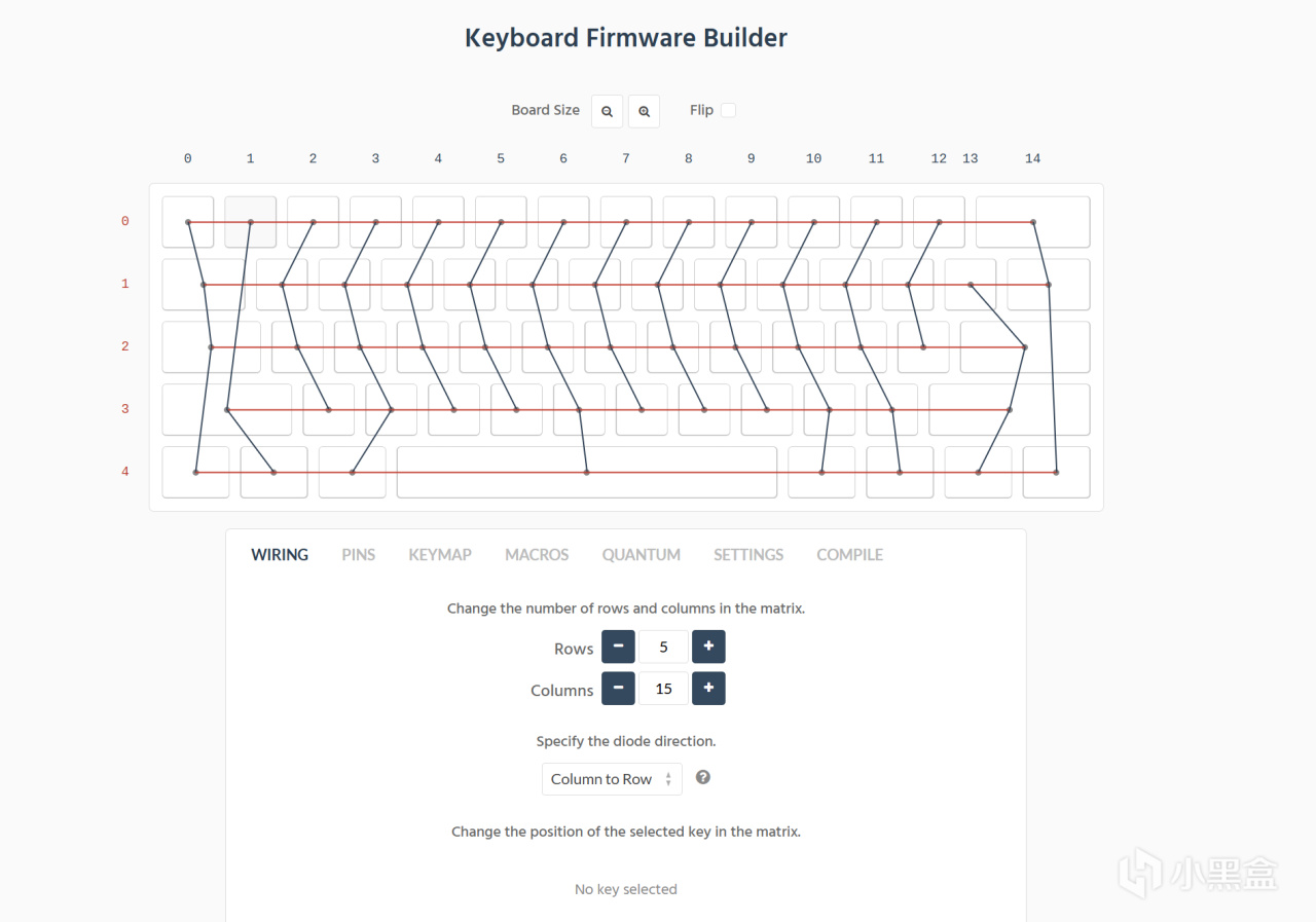wiring這裏可以設置鍵盤的總行/列數和全鍵無衝二極管的朝向(列到行與行到列),點擊一個按鍵後可以指定行與列