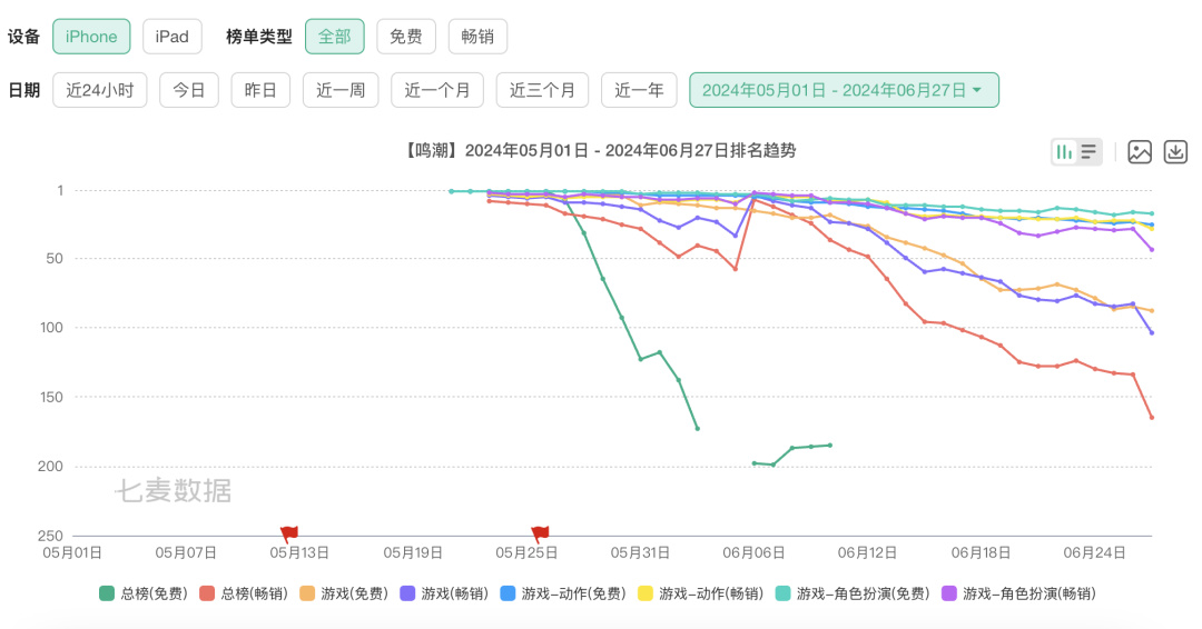 不難發現,每個代表着版本更新的小紅旗節點,都是一個《 鳴潮 》熱度的峯值。