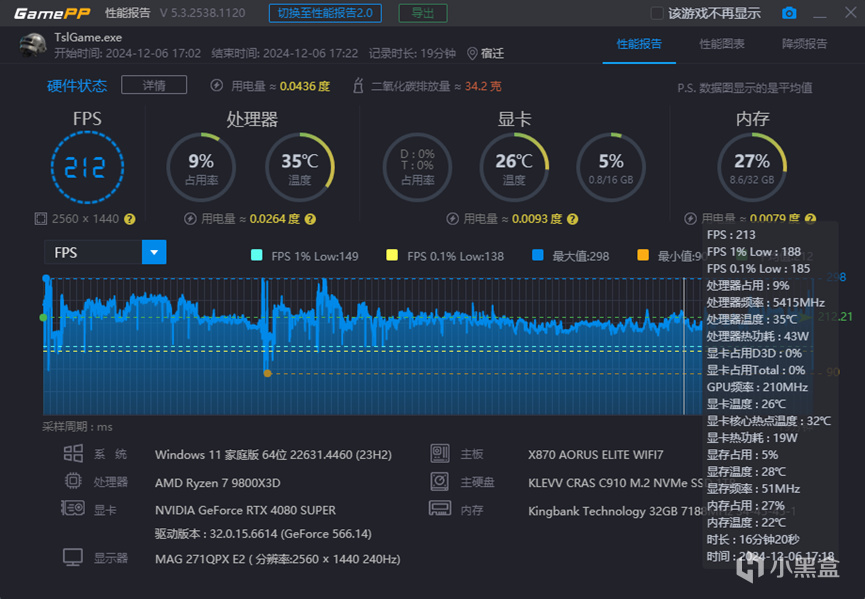 最後看下《絕地求生》的幀率表現,強如9800x3D+4080S,平均幀也就210+,搭配微星MAG 271QPX QD-OLED E2算是水桶組合,喜歡喫雞的朋友可以參考下了~
