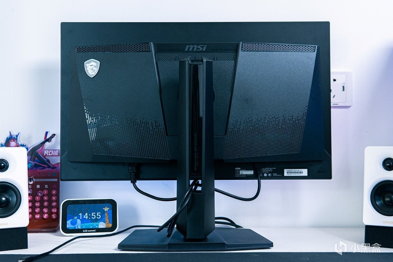 底座調節,微星MAG 271QPX QD-OLED E2支持俯仰、升降、偏轉、旋轉,可用姿勢非常多,調節也比較順滑,微星MAG 271QPX QD-OLED E2重量約爲8kg,還是很有分量感的,調節屏幕過程中底座沒有絲毫晃動。