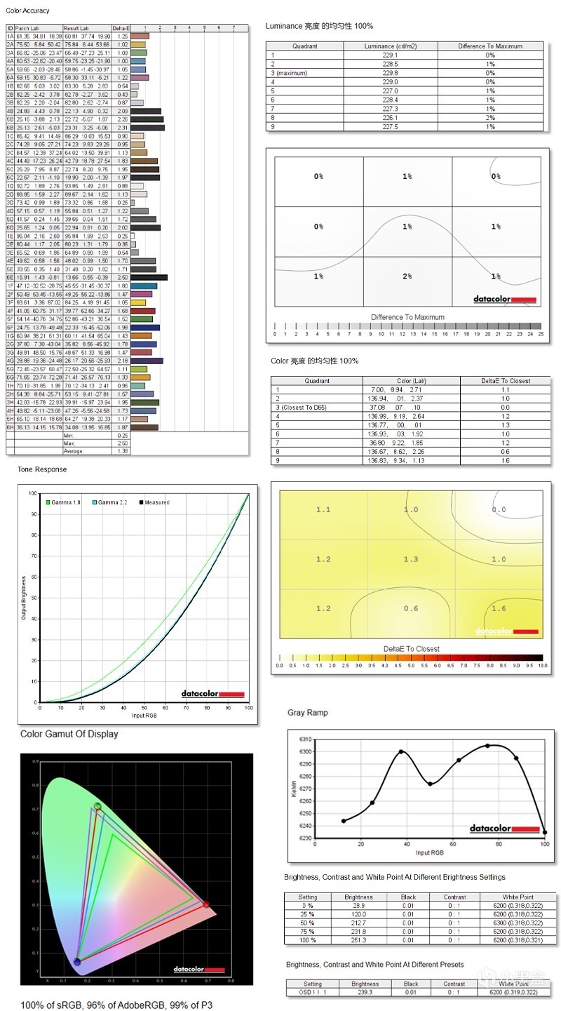 默認模式下,使用紅蜘蛛實測,微星MAG 271QPX QD-OLED E2色域覆蓋99%DCI-P3,色調響應和標準光度2.2基本吻合,灰階絕對溫度在6240K-6310K之間,稍稍偏暖,SDR最高亮度在251nit左右,白點溫度6200K,色彩均一性方面,ΔE最大1.6,亮度均一性方面,最大偏差2%,色彩精準度上,平均ΔE爲1.38,總體表現優秀。