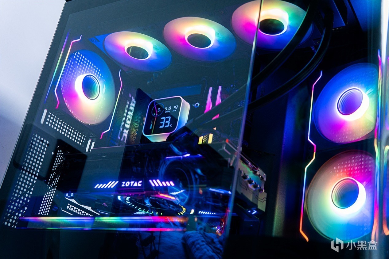 入手海景房,肯定是想玩燈的,索泰RTX 4080 SUPER 16G PGF OC風扇面以及側面有大面積燈區,整機黑的五彩斑斕,ARGB效果不錯,性能和顏值都沒得說。很多朋友會更喜歡白色海景房,想要一套白色桌面的話,還可以關注下微星新發布的白色款 MPG 321URXW QD-OLED,31.5英寸+4K240Hz,大屏高分辨率都有。