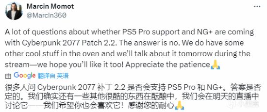 大约一年前的这个时候,CD Projekt Red为《赛博朋克2077》提供了最后一次重大内容更新,由于大部分的开发人员都已经转移到其它项目,人们原本以为这款游戏不会再次得到重大更新。对于最新的更新,CD Projekt全球社区总监Marcin Momot在推特上表示:“团队仍有余力。”不过,他也确认2.2版本不会引入对PS5 Pro的支持以及新游戏+模式。