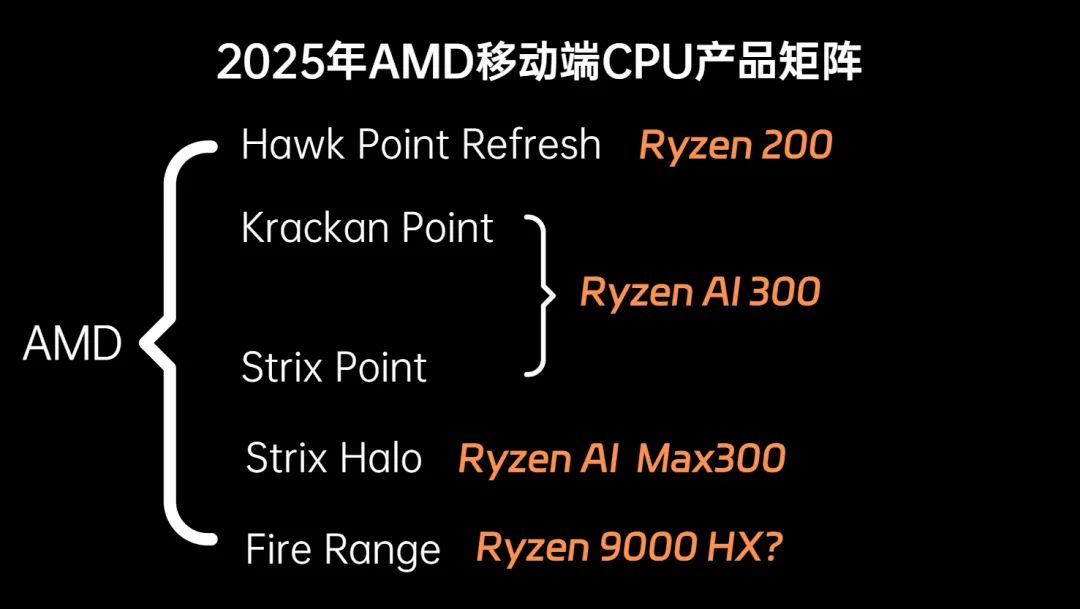 AMD这边,Fire Range,也就是HX系列采用桌面端下放架构,有X3D版本,Zen5桌面端的游戏性能大家有目共睹,推测移动端应该也有不俗的游戏性能,配上5080或者5090,就是明年游戏本的配置天花板,但这个系列只有R9,12核心起步;