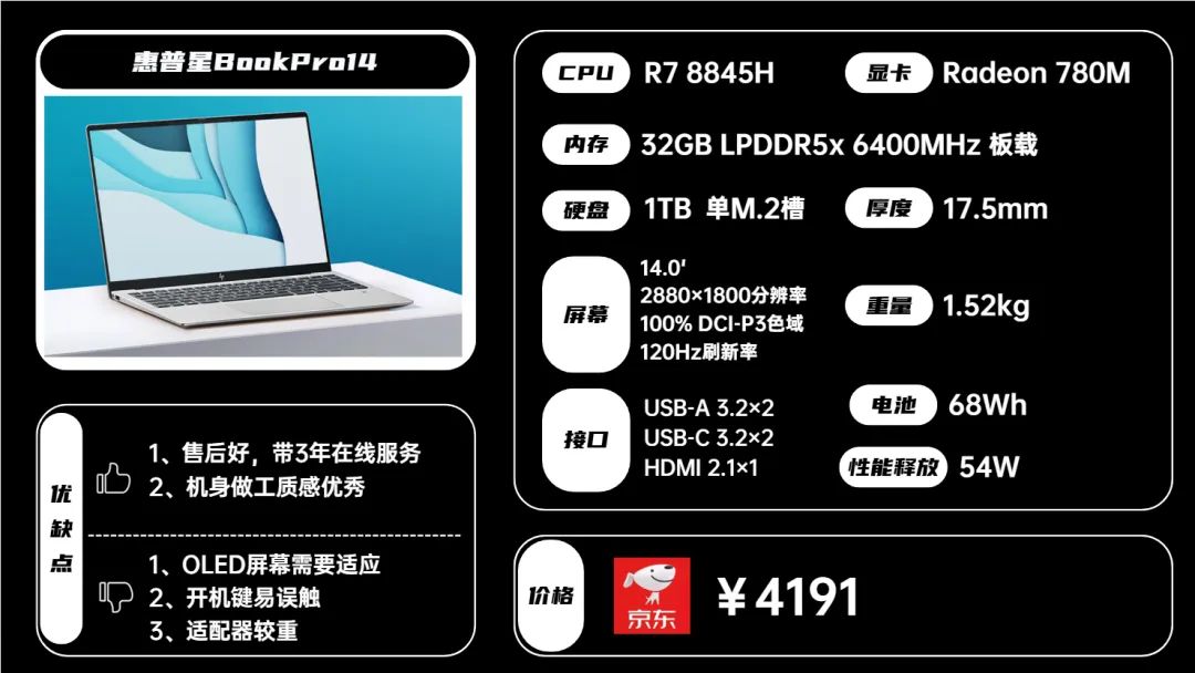 如果想要买一线品牌,可以考虑惠普的星Book Pro 14,补贴后仅需4200元不到,8845H+32G内存+2.8K屏幕的配置,性价比在几款一线品牌的机型中非常突出。